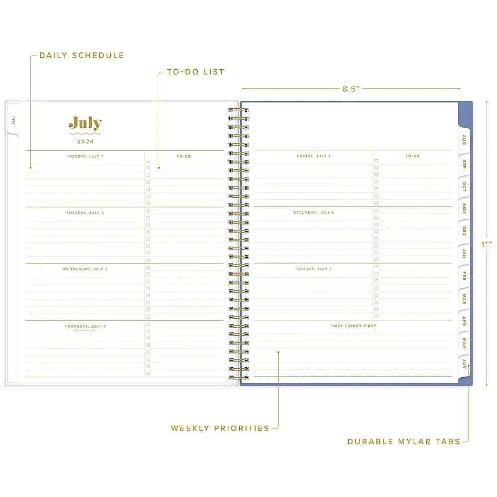 - Weekly and monthly academic planner covers a 12-month date range from July 2024 to June 2025
