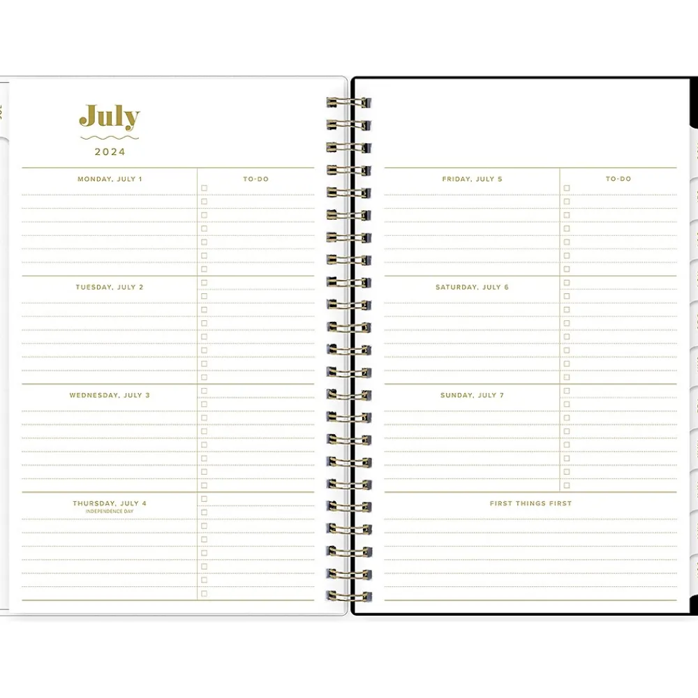 - Weekly and monthly academic planner covers a 12-month date range from July 2024 to June 2025