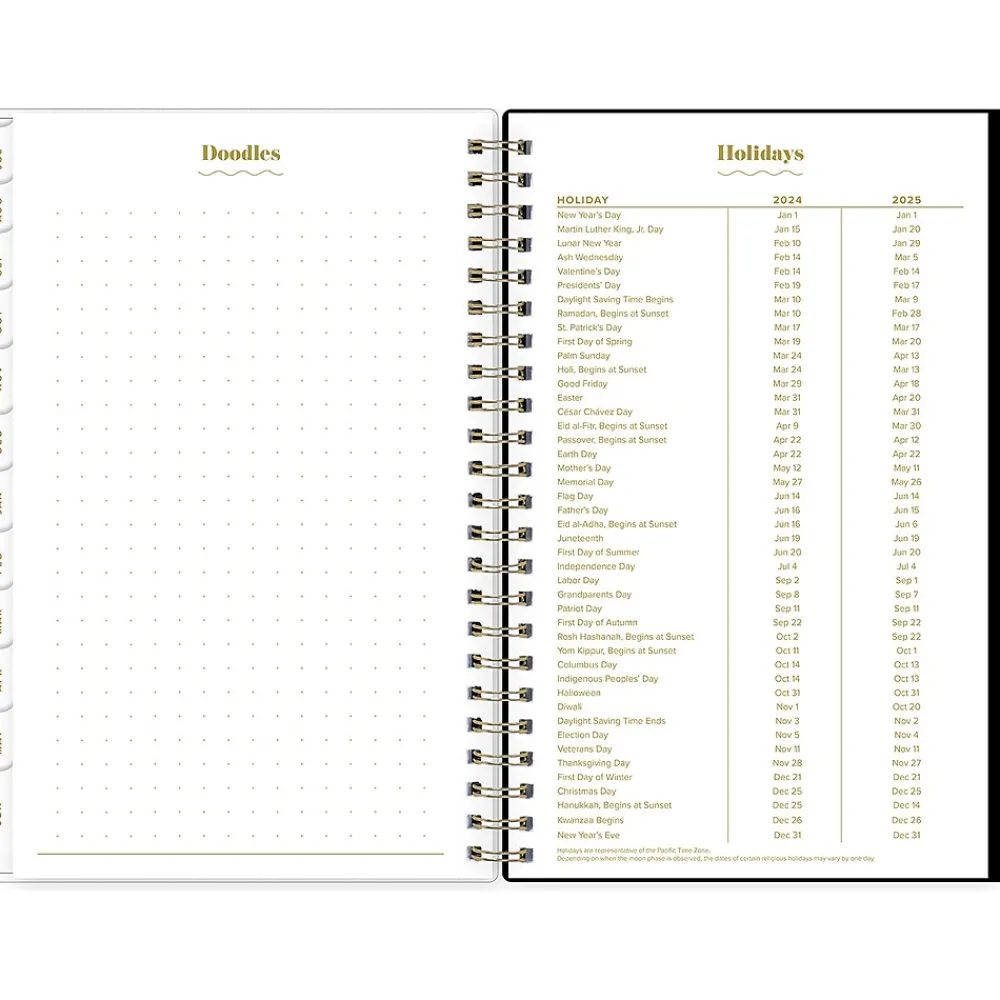 - One week per view, one month per view, notes pages, reference calendars, contacts, goals, holidays, and important dates