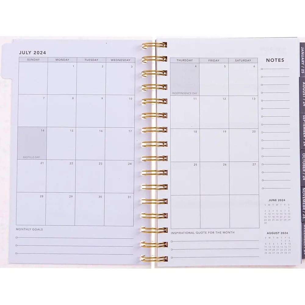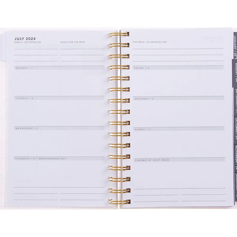 - One month per view, one week per view; monthly layouts include sections for notes and goals and are equipped with tabs for easy access; each weekly spread includes the week’s priorities, with space to write notes for each day, including the weekend