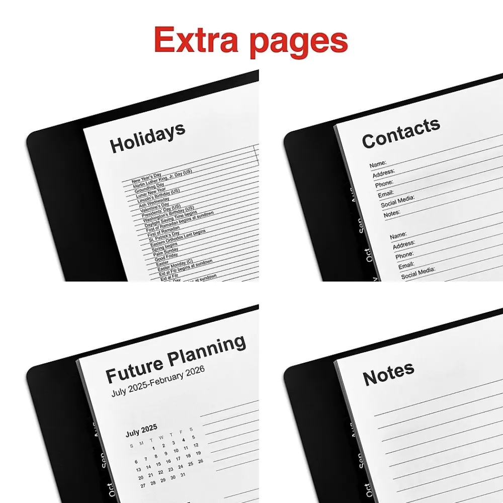 Plan your day in detail with this daily appointment book. The spiral twin-loop wire binding makes it easy to flip through the pages, while the black leatherette cover with a silver logo lends a professional look. This Staples 5 x 8-inch 2024-2025 daily appointment book features appointment pages with 15-minute intervals so you can track important events.