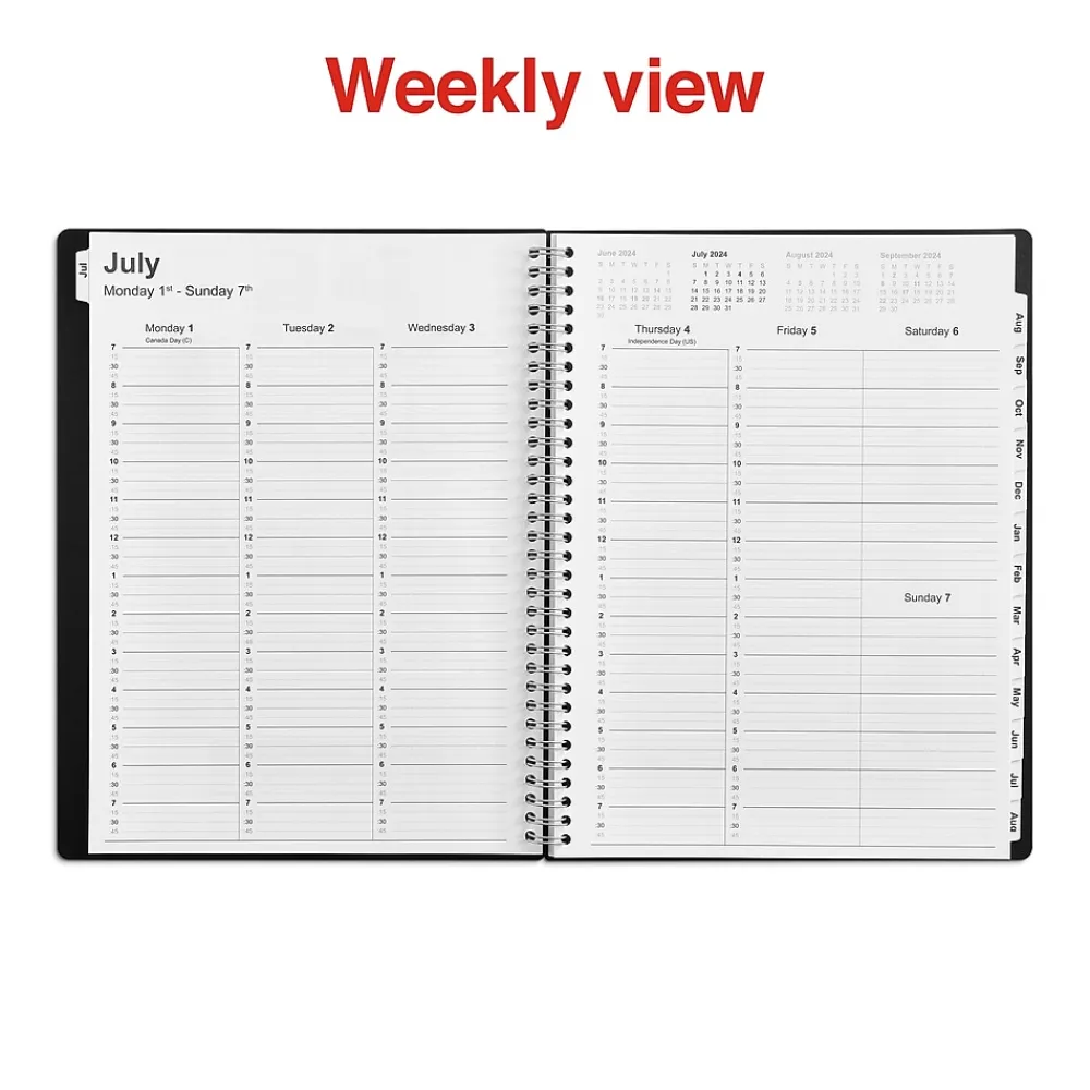 Complete office tasks with this black weekly & monthly planner. The single spiral binding holds the pages together and allows quick flip-throughs, while the poly cover material withstands daily handling. This Staples 8 x 11-inch back July 2024 to June 2025 weekly & monthly planner has 14 tabs for quick access to information and a built-in pocket for receipts and loose sheets.