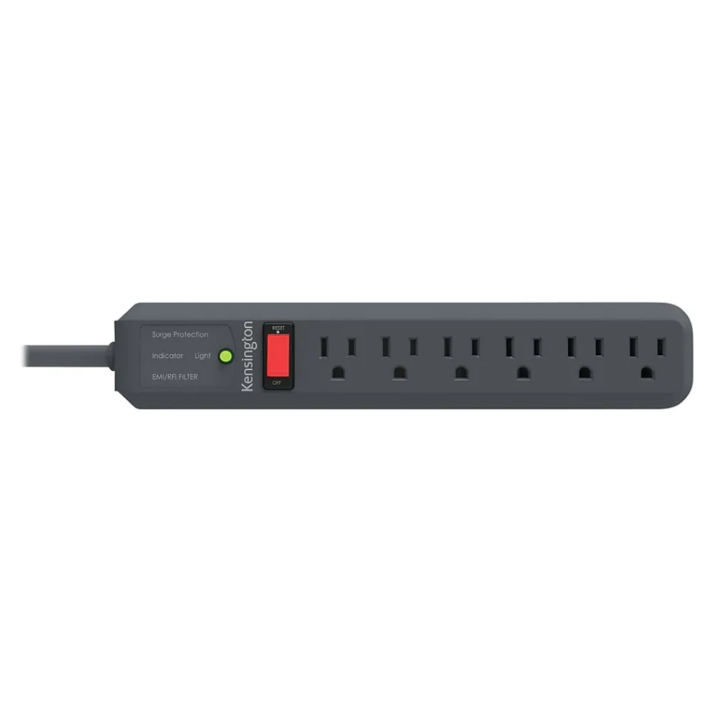 Create a central power hub for a computer and peripherals or other office electronics with this surge protector. Six thoughtfully spaced three-prong outlets make it easy to plug in all your essential devices, while the single switch lets you shut off the power source to all items simultaneously. A handy indicator light gives you a quick alert when surge protection is working. This power strip features a generously sized 15-foot cord, providing flexible placement options behind a desk, cubicle partition, or media stand. With a low-profile design and neutral gray color scheme, this Kensington Guardian 540-joule surge protector blends seamlessly with your equipment and office decor.