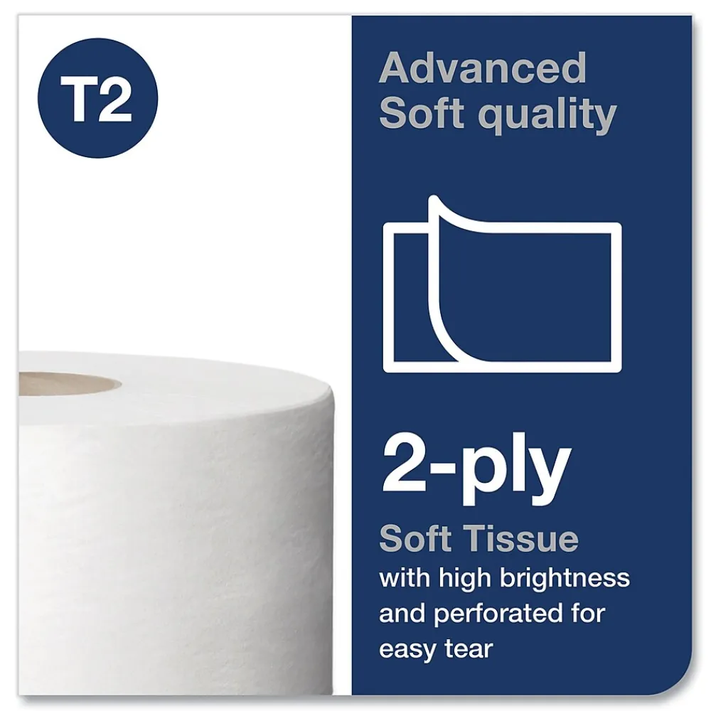 TorkĀ® Advanced Jumbo Bath Tissue’s high capacity allows for fewer refills and reduced labor. Our roll design ensures easy and intuitive maintenance, refilling and use. Large size reduces pilferage as it is hard to conceal and can’t be used at home. Suitable for high to medium traffic restrooms and easy to maintain. This bath tissue is perforated for ease of tearing. Fewer cores and no wrappers leads to source reduction and less waste. Tork toilet paper has rapid breakup, ideal for all plumbing systems. All Tork bath tissue products are safe for septic systems. Available in an Easy HandlingĀ® carry box.