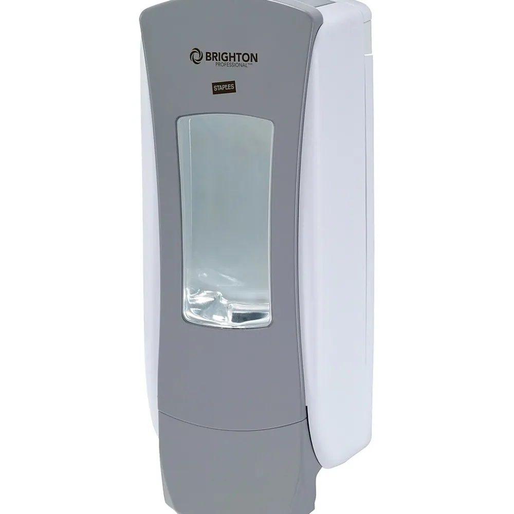 The Brighton Professional white/gray foam soap dispenser measures 11 4/5″ x 4 3/5″ x 3 9/10″ and has an optional key lock for safety. The dispenser features one-hand-push operation and can hold the contents of a 250 ml. sealed refill.
