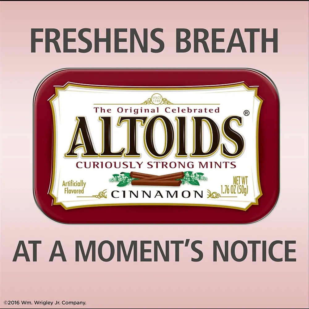 Always stay fresh and ready for what comes your way with ALTOIDS Cinnamon Breath Mints. From business meetings in the boardroom to first dates at your favorite watering hole, there’s never a good time to have bad breath. These curiously strong breath mints will help keep you feeling confident for every adventure. Packaged in a pocket-sized tin, it’s easy to take ALTOIDS Mints on the go, to keep them in your car or to stock them in your desk. No matter where you are, pop one of these precocious mints, and the next thing out of your mouth is sure to be sheer confidence. Now that’s the curious strength of ALTOIDS!