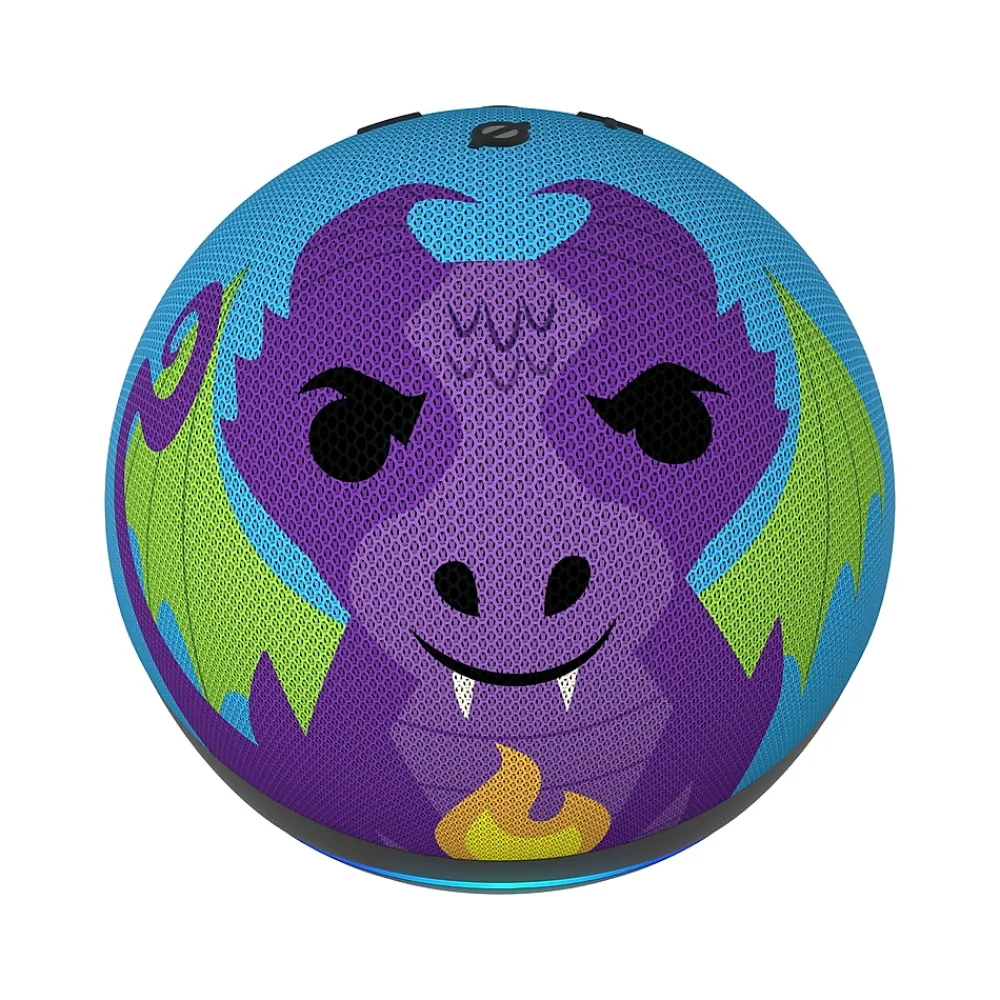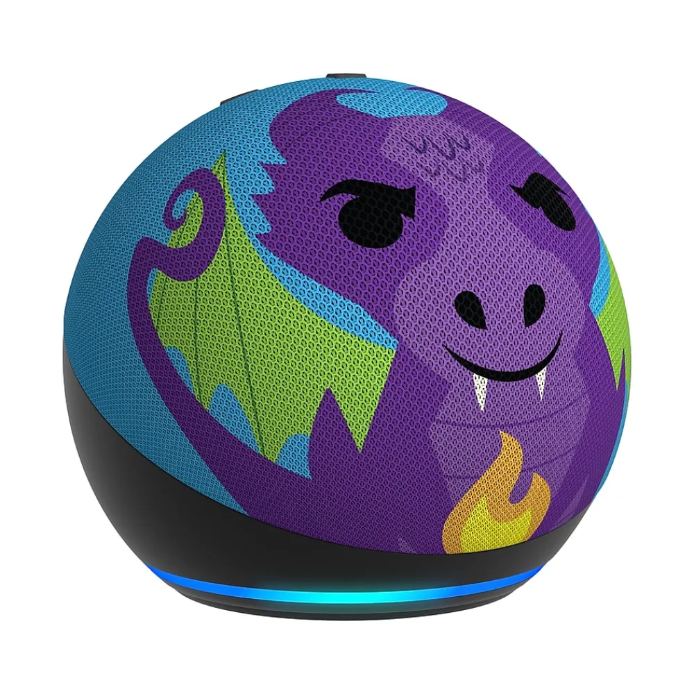 Meet Amazon Echo Dot 5th Gen Kids Dragon – Amazon’s popular and incredibly cute smart speaker with Alexa. The fun design features an improved speaker, delivering clear vocals and vibrant sound. Kids can ask Alexa for homework help, to play music, read bedtime stories, and more.