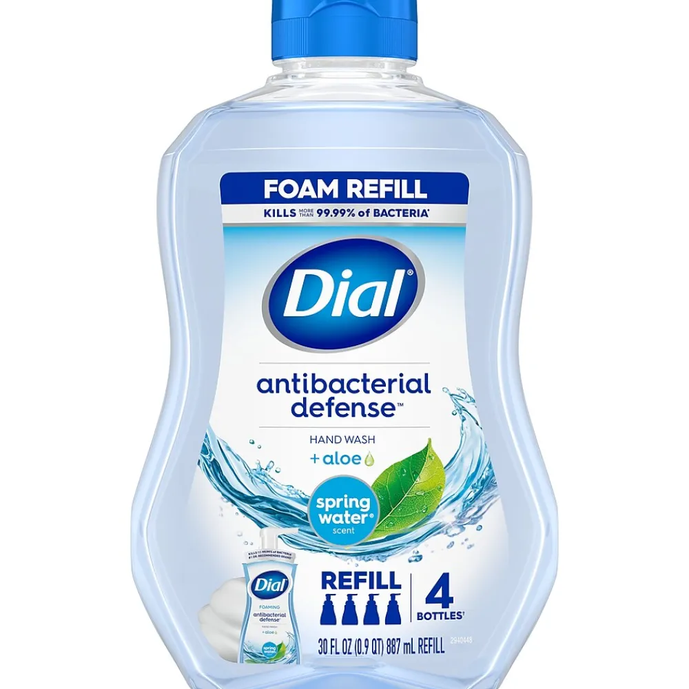 Enjoy the fresh scent of the Dial Antibacterial Defense Spring Water foaming hand wash. The formula contains aloe vera and kills more than 99.99% of bacteria while being gentle on skin, leaving it feeling soft, smooth, and healthy. Dermatologist-tested and approved as cruelty-free under the Leaping Bunny program. One refill bottle contains enough product to refill four Dial foaming hand wash bottles.
