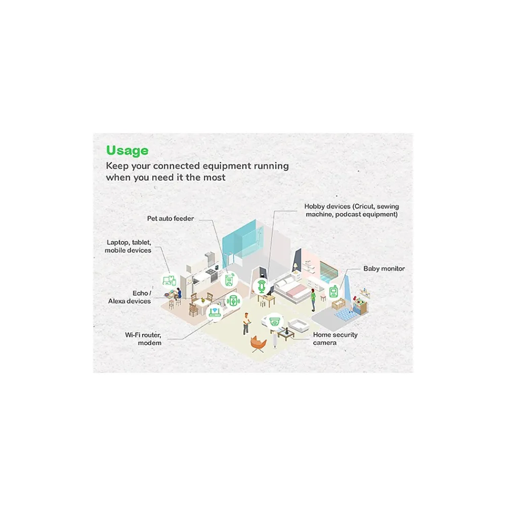 - 8 Outlets (NEMA 5-15R): 6 ups battery backup & surge protector outlets; 2 outlets with Surge Protection Only. Powerchute UPS management via dedicated data port (Windows 10, 22H2 Pro, 11 Pro. For Mac OS, use native “Energy Saver” Settings)