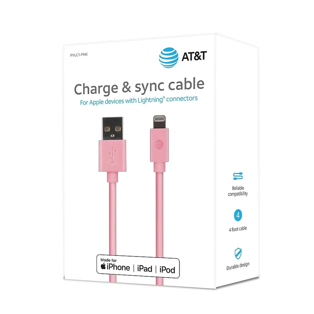 Stay connected with the pink 4 Ft. PVC Charge and Sync Lightning Cable from AT&T! This 4 ft. long PVC charge and sync USB to lightning cable is ideal for use everywhere. The pink, heavy-duty PVC cable has a durable design that provides high speed charging.