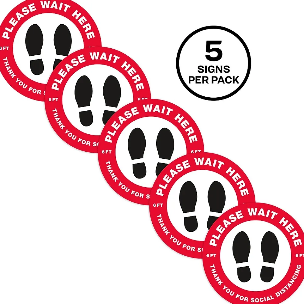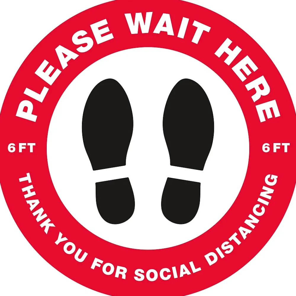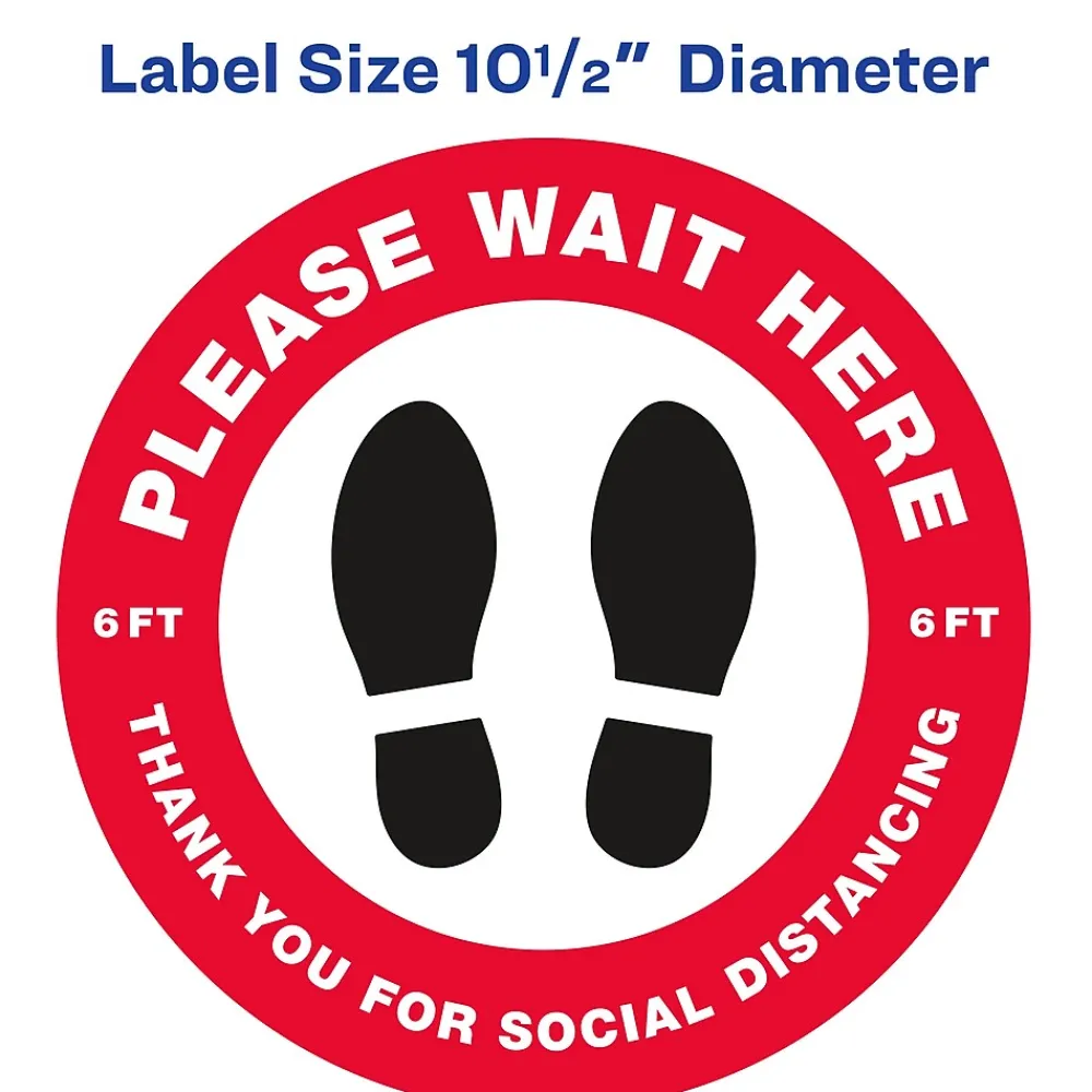 Keep people at a safe distance with round Avery “Please Wait Here” social distancing floor decals. Preprinted with an eye-catching red border and a semi-glossy finish, these large round “Please Wait Here” floor decals have a 10.5″ diameter and immediately stand out. Built to withstand the constant wear and tear of everyday foot traffic, these anti-slip vinyl floor decals are scuff resistant, water resistant and UV-coated for additional durability. Removable floor decals stick and stay to multiple indoor surfaces but also peel away cleanly. The removable adhesive also makes it easy to reposition the floor decals so that you can carefully adjust the placement of the vinyl floor decals to make sure that the spacing is just right. Preprinted social distancing floor decals are perfect for every type of location or business including retail stores, restaurants, hair salons, banks, airports and more. Includes 5 preprinted removable vinyl decals.