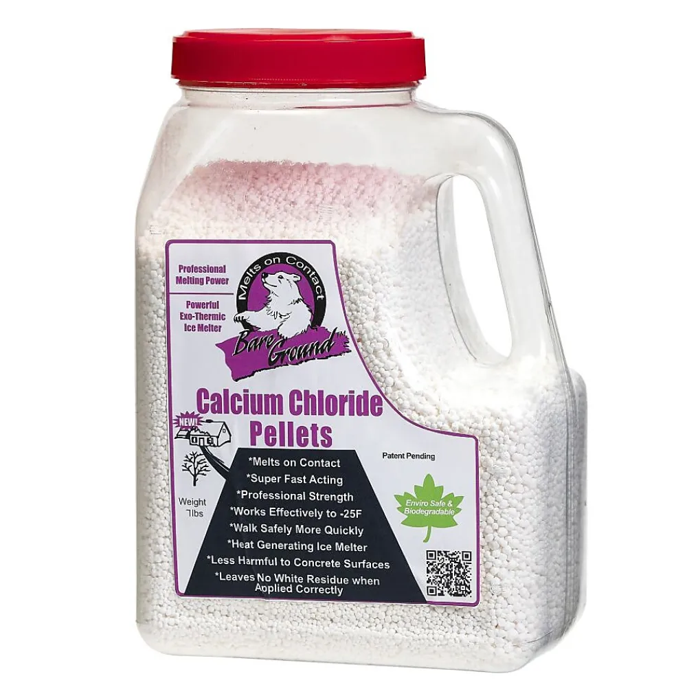 The Bare Ground 7 lb. Winter Calcium Chloride Ice Melt Pellets are made from Calcium Chloride which is exothermic, meaning it will burn hotter and melt snow and ice faster. This 7 lb. shaker jug makes carrying and applying the granules simple and easy. The pellets are less damaging to concrete to help preserve your sidewalks.
