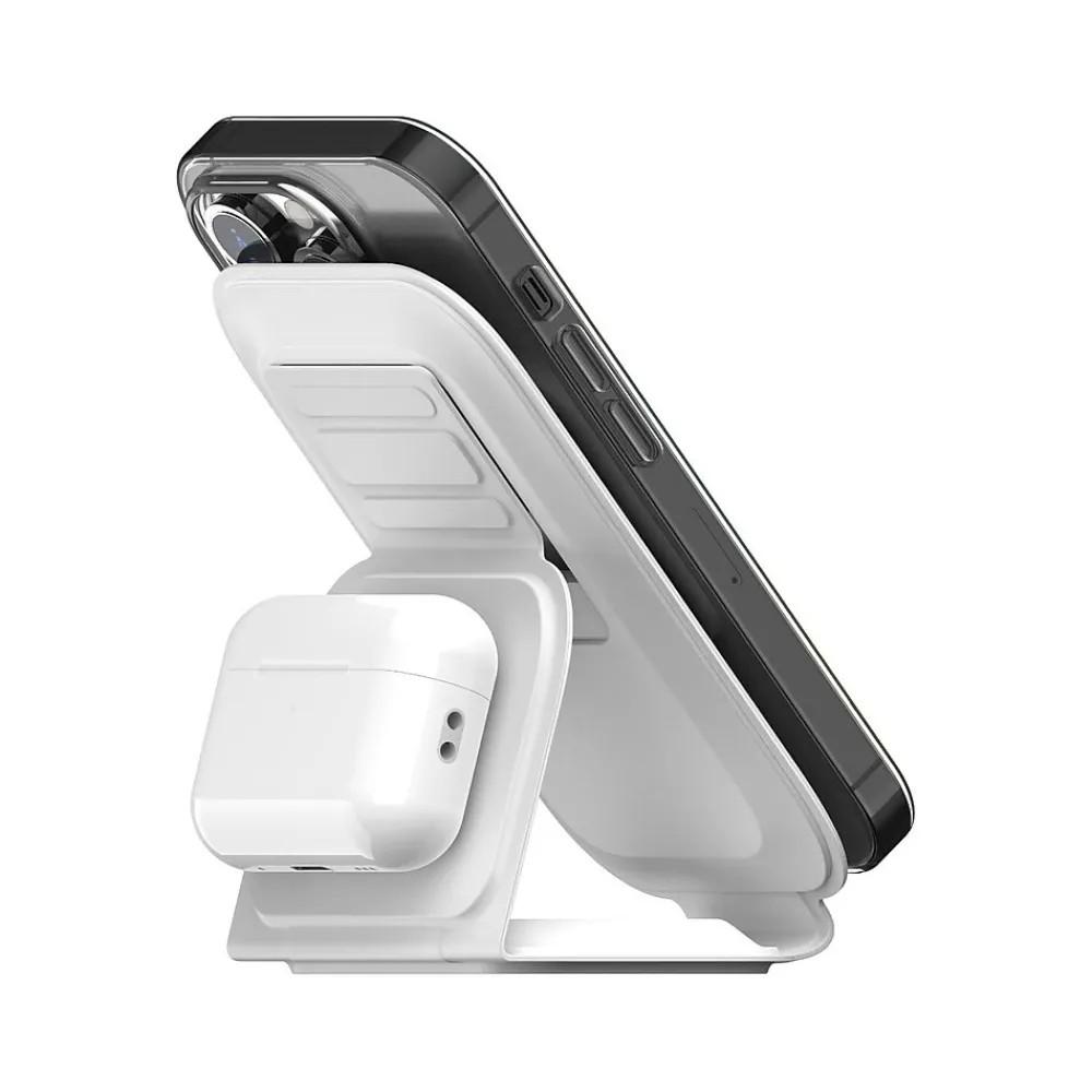 - This charging stand simultaneously and wirelessly charges iPhone 12 or later and an AirPods case