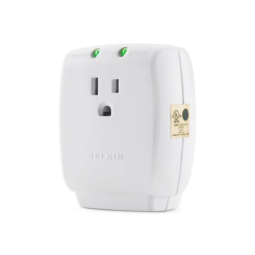 The one-outlet Home Series SurgeCube from Belkin offers wall-mount-direct, plug-in surge protection for your general electronics, home appliances, and more. This single outlet model boasts 885 joules, 45,000-Amp maximum spike current, and a lifetime $50,000 Connected Equipment Warranty for your peace of mind.