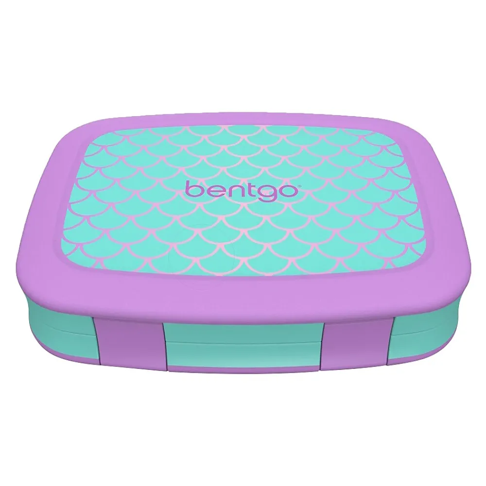 - Bento-style lunch box for kids features compartments for fruit, veggies, dip, entree, and dessert