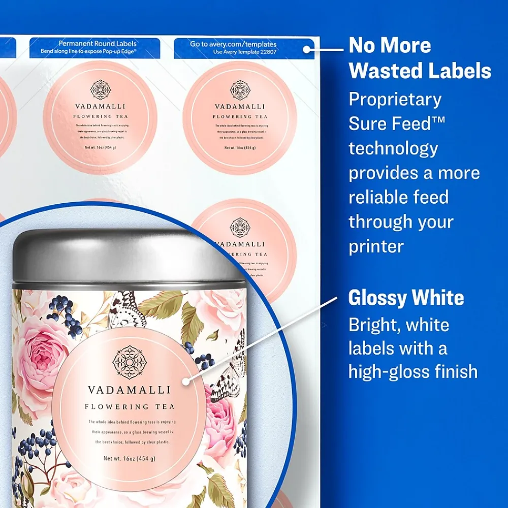 Create a premium appearance in an instant with Avery glossy white labels. This eye-catching material adds a beautiful sheen that helps your print appear brighter and sharper. These sheets also feature exclusive Avery Sure Feed(R) technology to improve print alignment and avoid paper jams. The textured, blue strip on the top of each sheet provides better grip for your printer rollers and helps feed each page accurately. The permanent adhesive makes sure that the labels hold fast to multiple surfaces including paper, cardboard, plastic, glass, painted metals and film. The unique Easy Peel label design also lets you apply labels as fast as you need them. Just fold the sheet back to display the Pop-Up Edge for convenient and quick peeling. Avery Design & Print also makes it easy to create beautiful, personalized labels from your office or home. The free browser-based software has all of the tools you need to make planner labels, wedding labels, teacher stickers, candy jar labels and more. Try it out today at avery.com/templates. Please Note: These labels are only compatible with laser printers and the print has a high chance of smearing when used with inkjet printers.