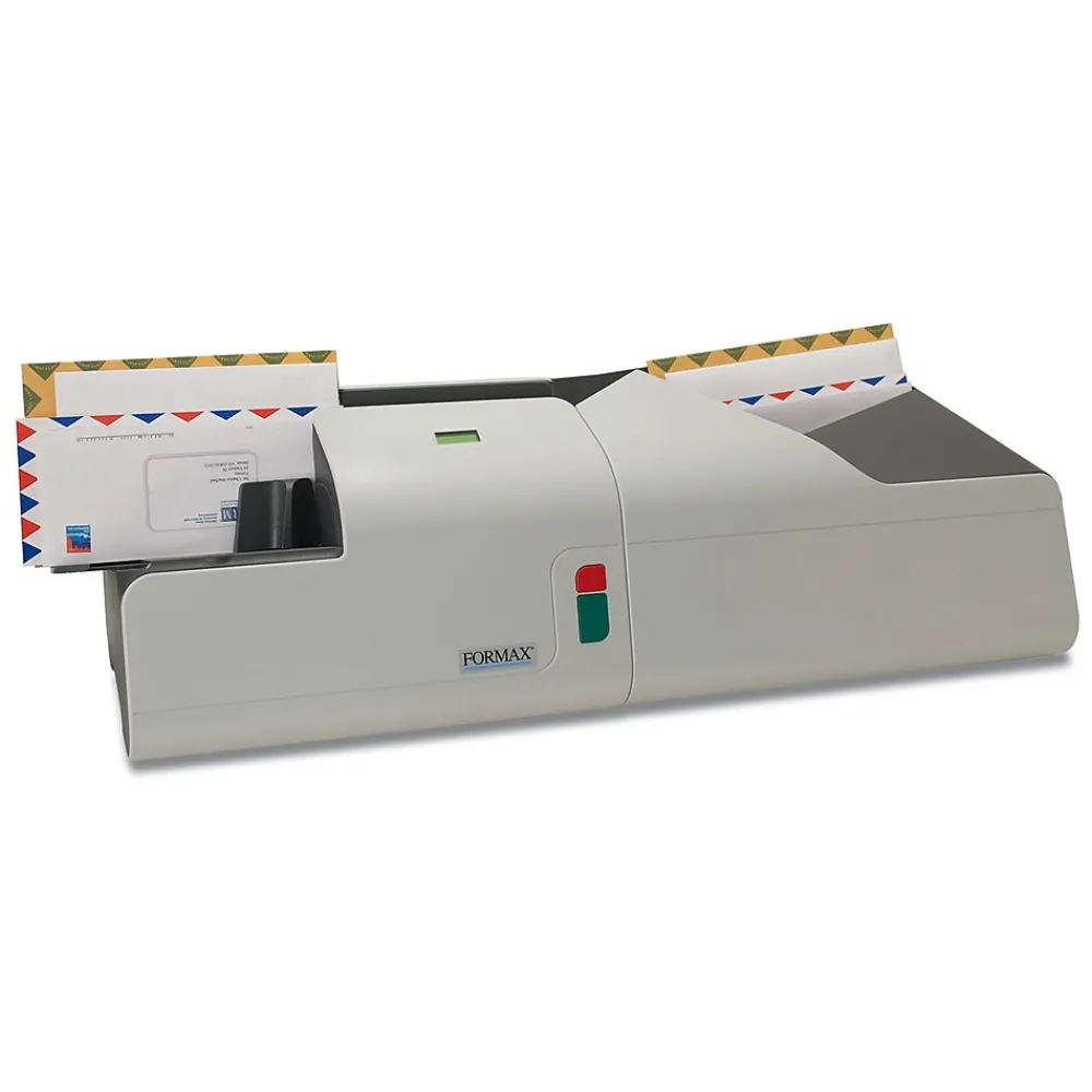 Streamline your mail processing with the Formax FD 452 envelope opener, reaching speeds of up to 300 envelopes per minute. Its user-friendly design allows for quick setup and operation—load mail, press start, and you’re done. Unlike other envelope openers, the cutting mechanism slits only one side of the envelope, keeping mail contents intact and eliminating messy paper scraps. The FD 452 accommodates various envelope sizes, from #10 to flats, without pre-sorting. A support arm handles large envelopes, and a push arm ensures constant pressure for quick and accurate feeding. The opened mail neatly stacks in the catch tray, while the LCD counter facilitates easy tracking.