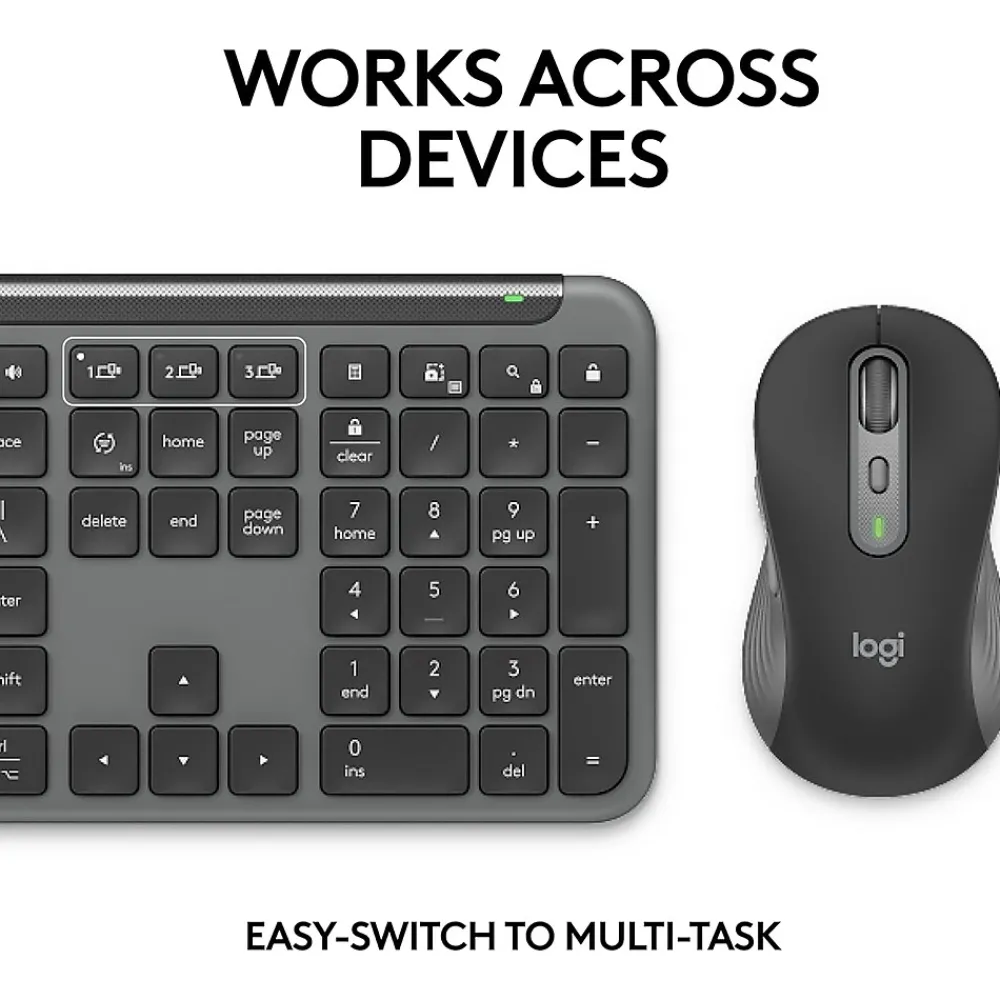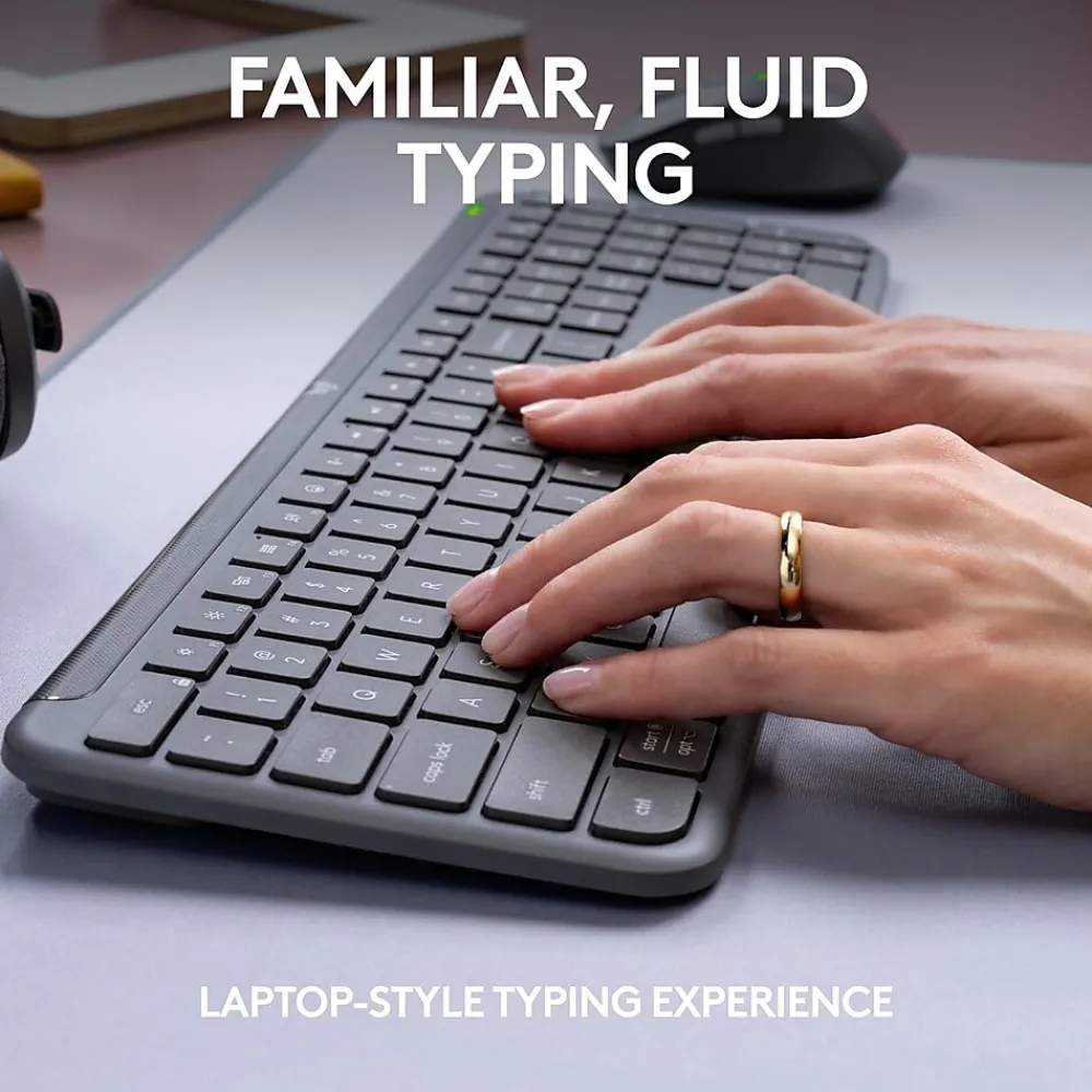 Welcome to a new standard for wireless keyboards and mice. Signature Slim MK955 combines the slim profile and laptop-style typing experience that employees desire, plus a contoured mouse shaped for comfort. It features precise and super fast scrolling along with multi-device switching for elevated productivity. With quiet typing and clicking, this combo is ideal for open workspaces.This combo works with Mac, Windows, and ChromeOS (6) (7); includes Logi Bolt for reliable and secure wireless connections; and is easy to deploy. The plastic parts are made with a minimum of 62% post-consumer recycled plastic (2), so it’s a choice you’ll feel good about.