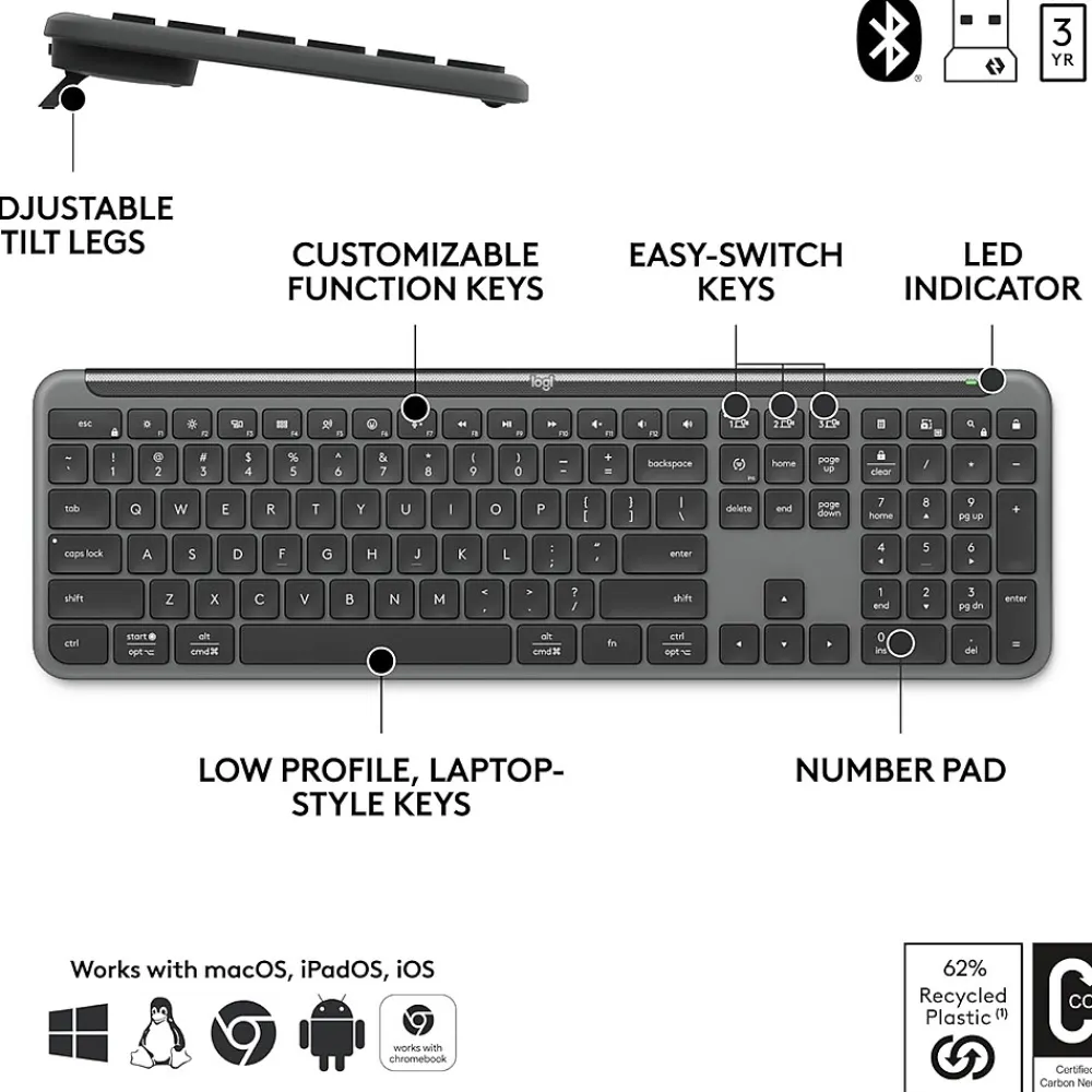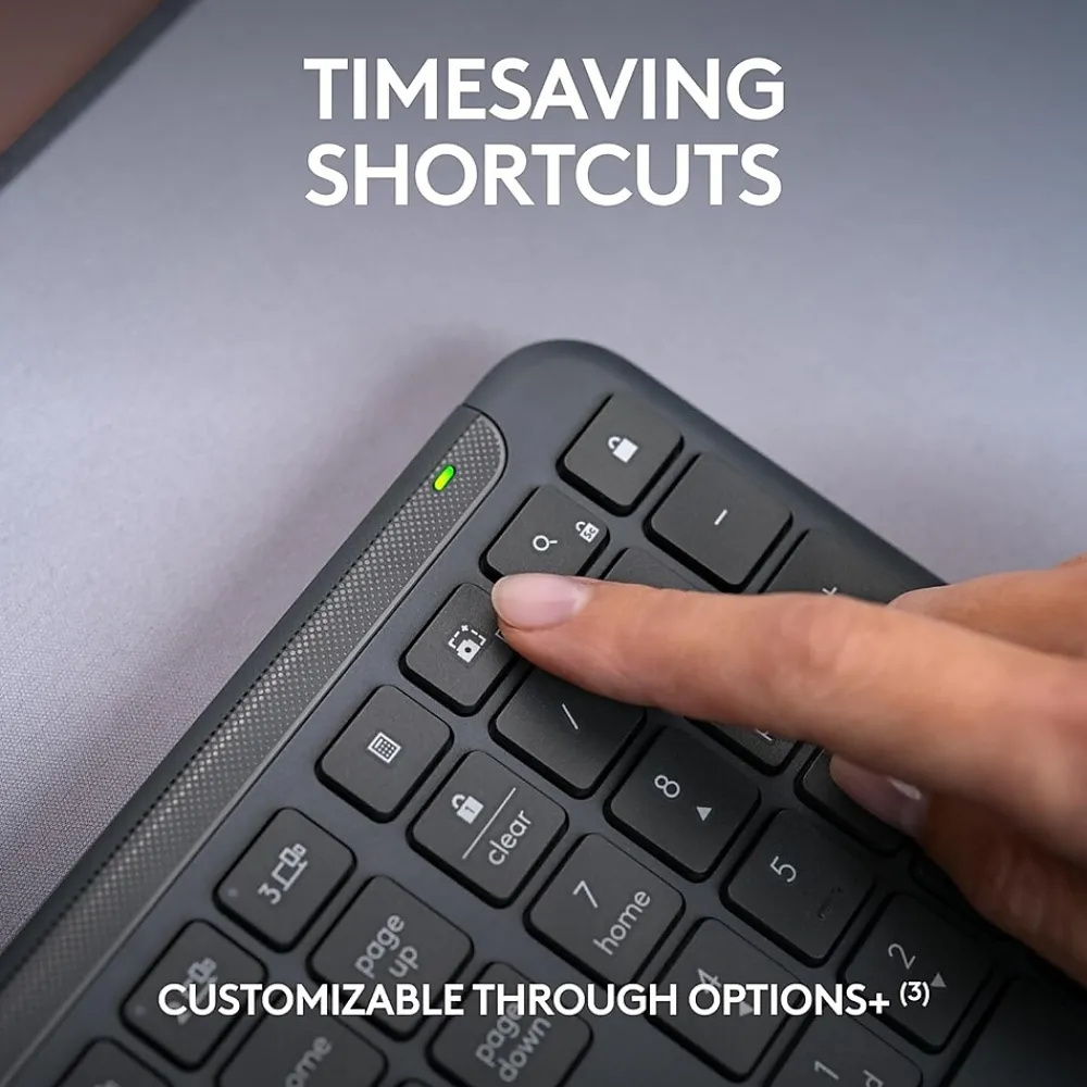 - Works Across Devices: Connect wirelessly via Logi Bolt or Bluetooth and seamlessly switch between 3 of your devices with a press of the Easy-Switch button for easy multitasking