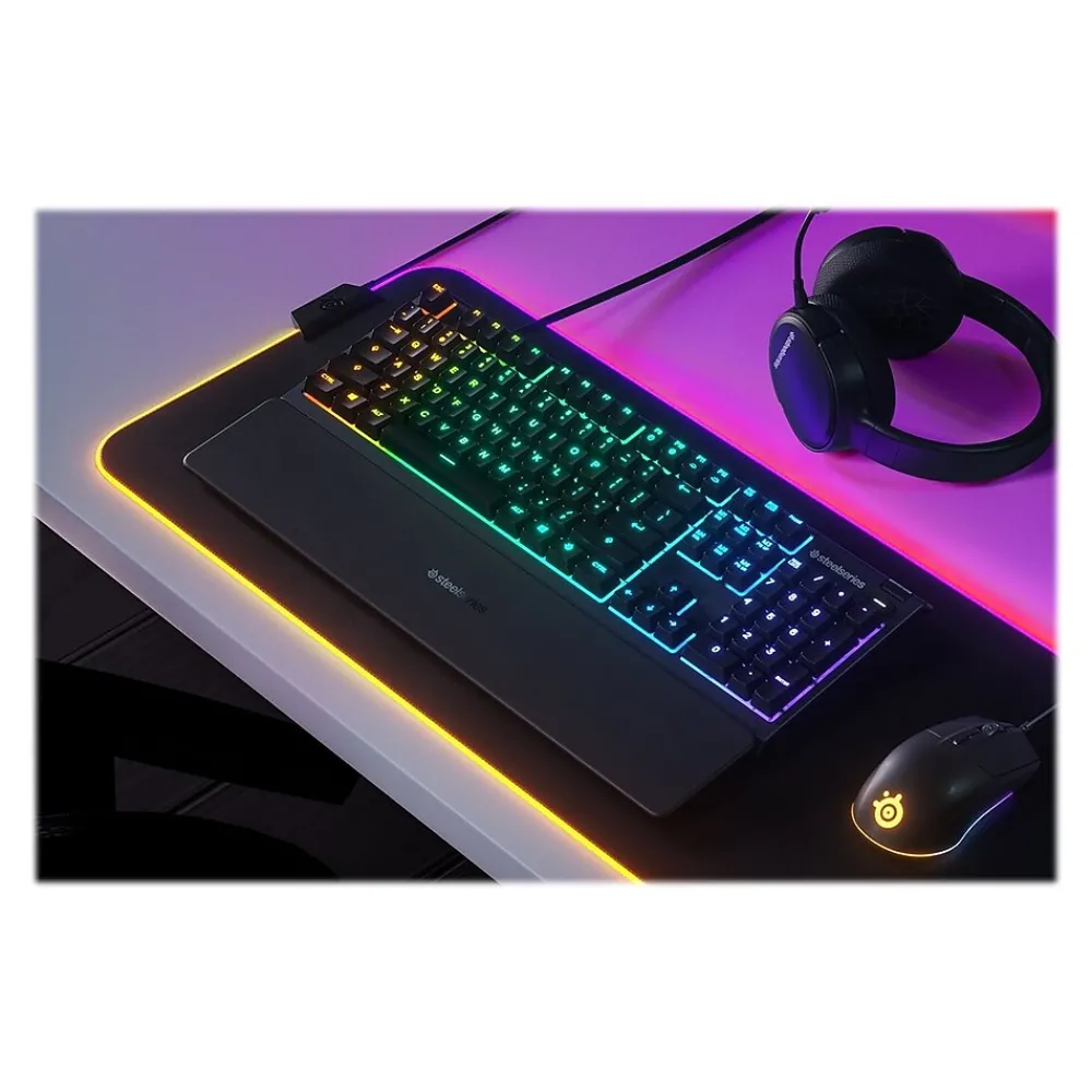 The Apex 3 gaming keyboard was built for the needs of gamers, with IP32 water resistance for protection against spills and accidents. Its whisper quiet gaming switches provide comfortable low friction performance for over 20 million keypresses. The keyboard includes 10-zone RGB customization, a premium magnetic wrist rest, dedicated multimedia controls, and gaming-grade anti-ghosting.