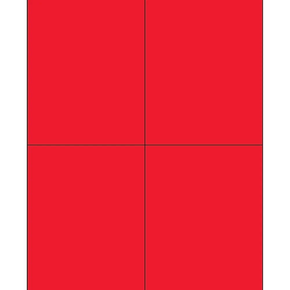 4 1/4″ x 5 1/2″ Fluorescent Red Rectangle Laser Labels. Use to create your own product or mailing labels. Labels work with both Laser and ink jet printers. Permanent adhesive. Labels stick to a variety of smooth surfaces including paper, corrugated, plastic, wood, glass and metal.