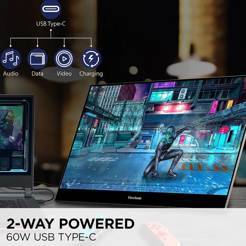 The ViewSonic VX1655-4K-OLED is a 15.6” portable monitor with native 4K resolution and advanced OLED technology for incredible visual performance on the go. Stunning 4K Ultra HD resolution delivers four times more pixels than Full HD monitors, so you can have the clarity and precision you need for work and play. An ultra-thin panel with the hardware integrated into the kickstand provides incredible stability, discreetly hides cable connectivity, and still allows for use in portrait and landscape modes. In addition, versatile connectivity options include two USB-C ports for 2-way charging, as well as mini-HDMI and a headphone jack. Measuring less than an inch thick and weighing under two pounds, the ultra-slim VX1655-4K-OLED perfectly fits into any bag, briefcase, or backpack so you can work wherever life takes you.