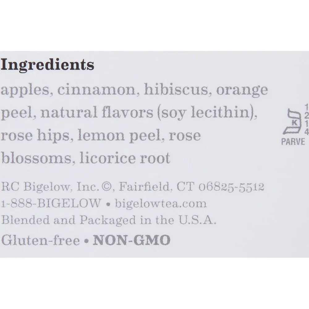 - Ingredients: apples, cinnamon, hibiscus, orange peel, natural flavors (soy lecithin), rose hips, lemon peel, rose blossoms, licorice root