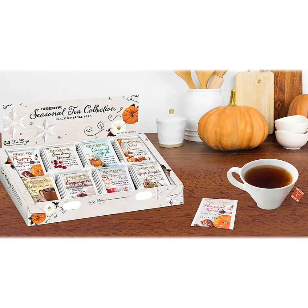 - Eight tea bags each of Pumpkin Spice, Salted Caramel, Hot Cinnamon, Eggnogg’n, Caramel Apple (caffeinated) and eight tea bags each of Cranberry Harvest, Peppermint Bark, and Ginger Snappish (caffeine-free)