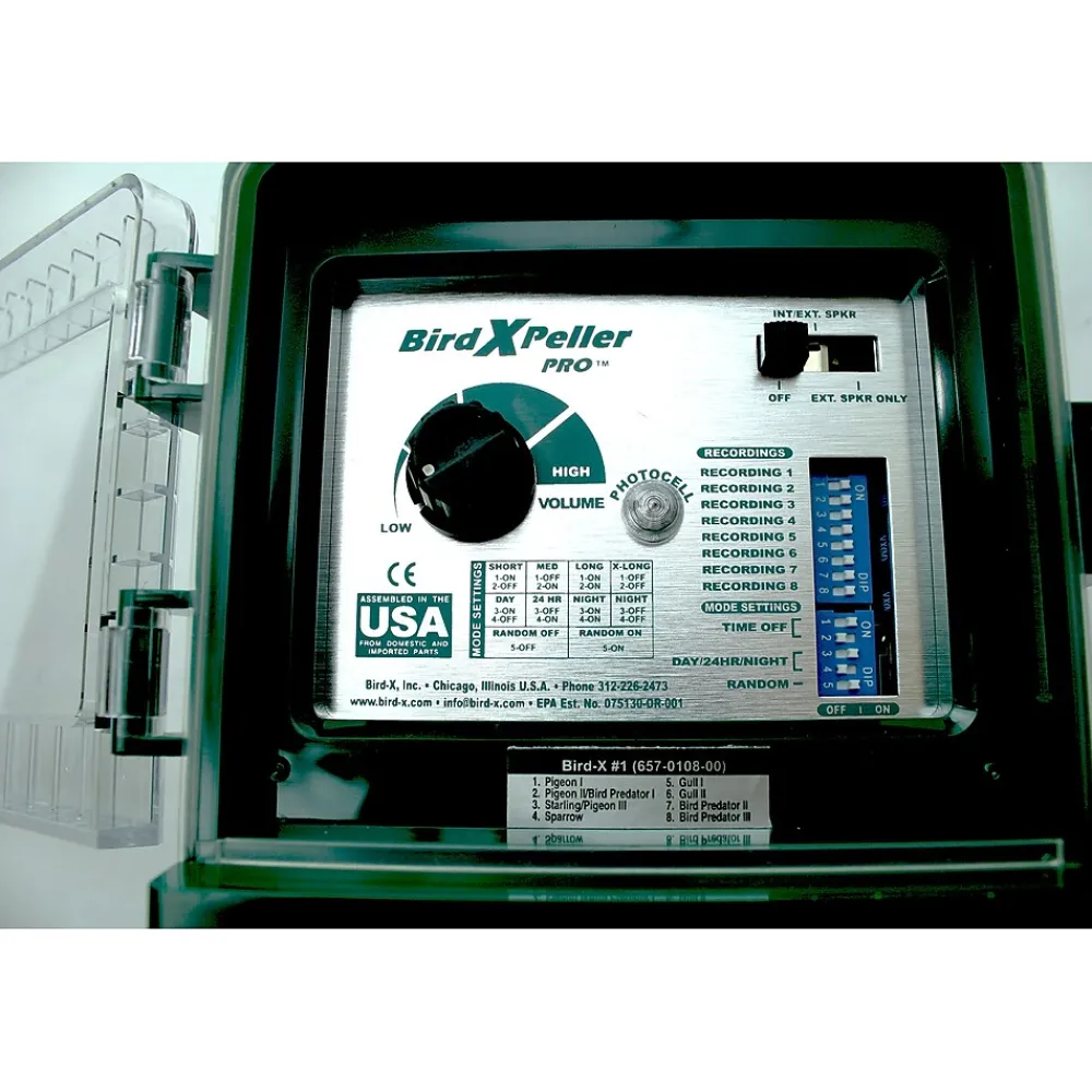 Keep birds away with the Bird-X Peller Pro Sonic Deterrent which broadcasts pre-recorded bird alarm calls and predator cries. This unit helps control birds outdoors with its sophisticated sonic technology. The Bird-X Peller is fully-programmable. You control the volume, how often it goes off and when it goes off. This unit is used to deter pigeons, starlings, sparrows, and seagulls and it can cover up to 1 acre.