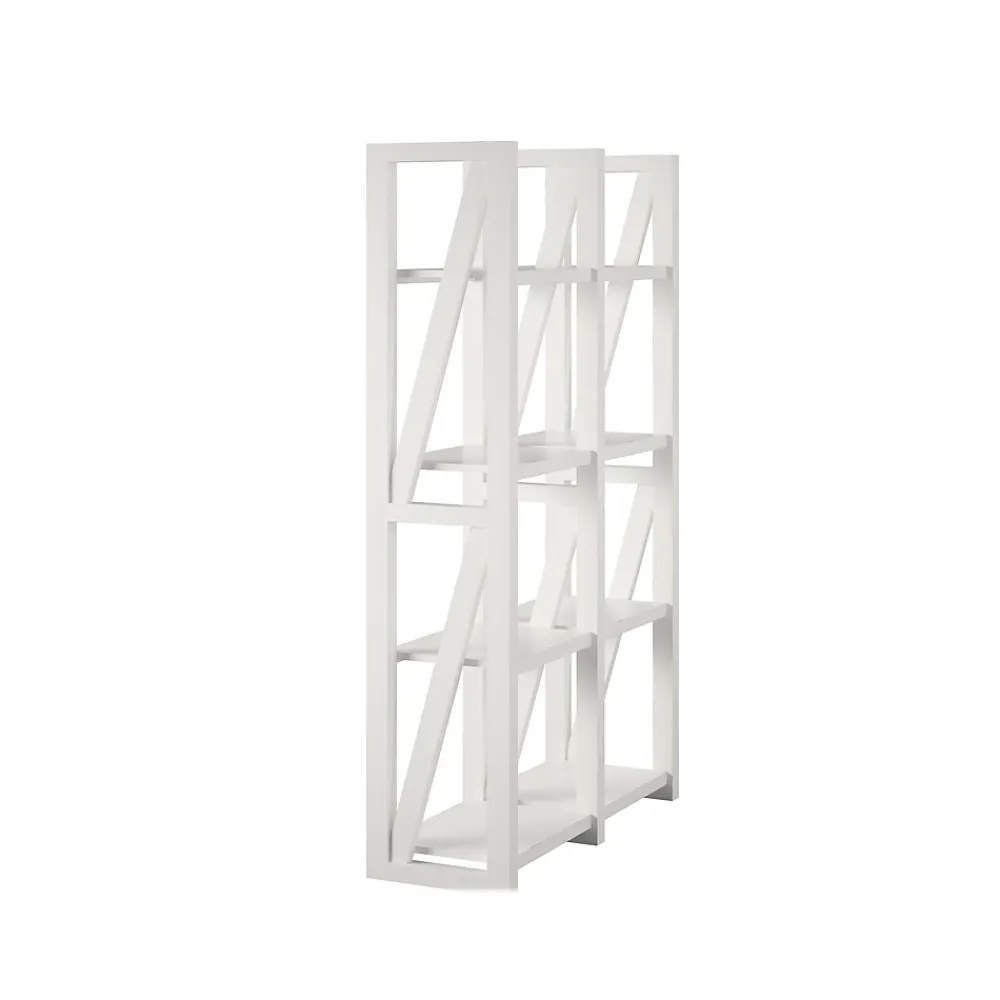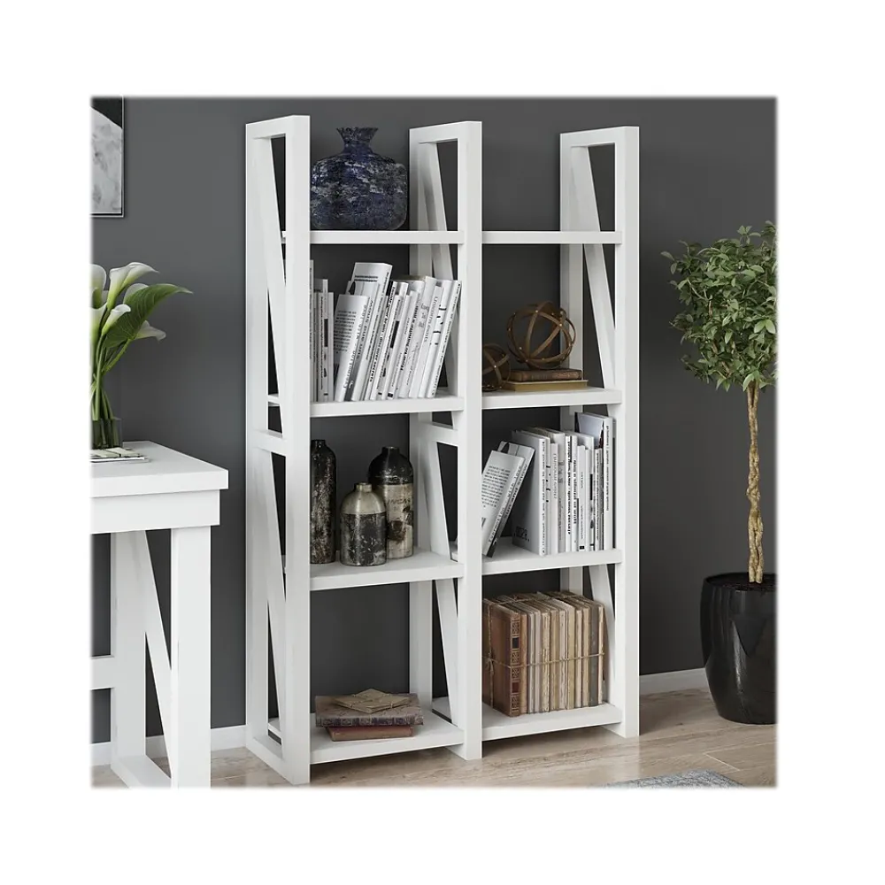 Create a beautiful rustic look in your living room, family room, den, or home office with the Ameriwood Crestwood home bookcase/room divider. This item has eight open shelves to keep your books, knick-knacks, decorative items, photos, and more. Use it as either a bookcase against a wall or get creative and use it to separate large space. The open design that is finished all the way around makes it easy to use in multiple fashions. The weathered white finish with gray rub-through gives this piece the ability to blend with cottage, rustic, shabby chic, or transitional styles. Made with painted MDF, this bookcase/room divider will withstand years of use. A wall anchor kit is included to secure the bookcase to the wall. Two adults are recommended to assemble.