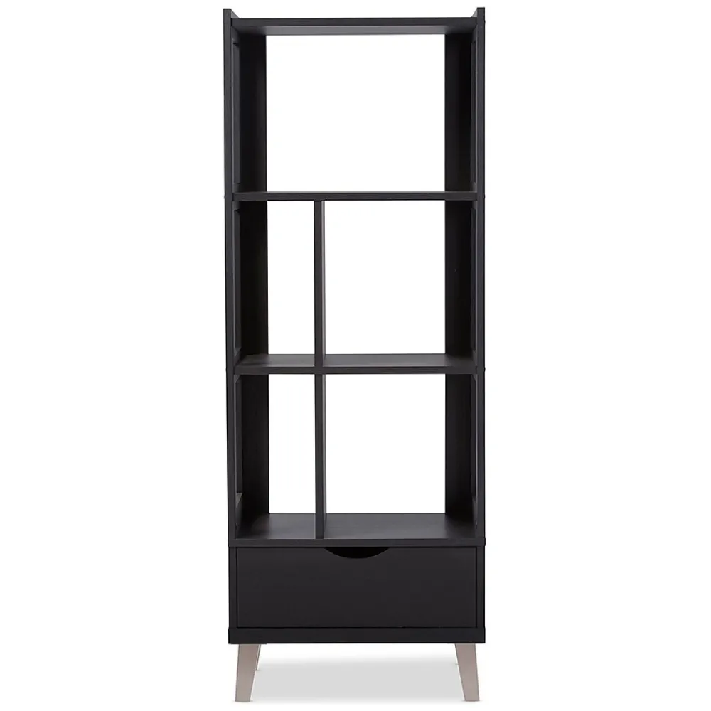 Simple and architectural, the Kalien dark brown wood leaning bookcase is reminiscent of modern and contemporary design.The Kalien’s clean and functional design features powder coated vinyl legs supporting the framework of the bookshelf.