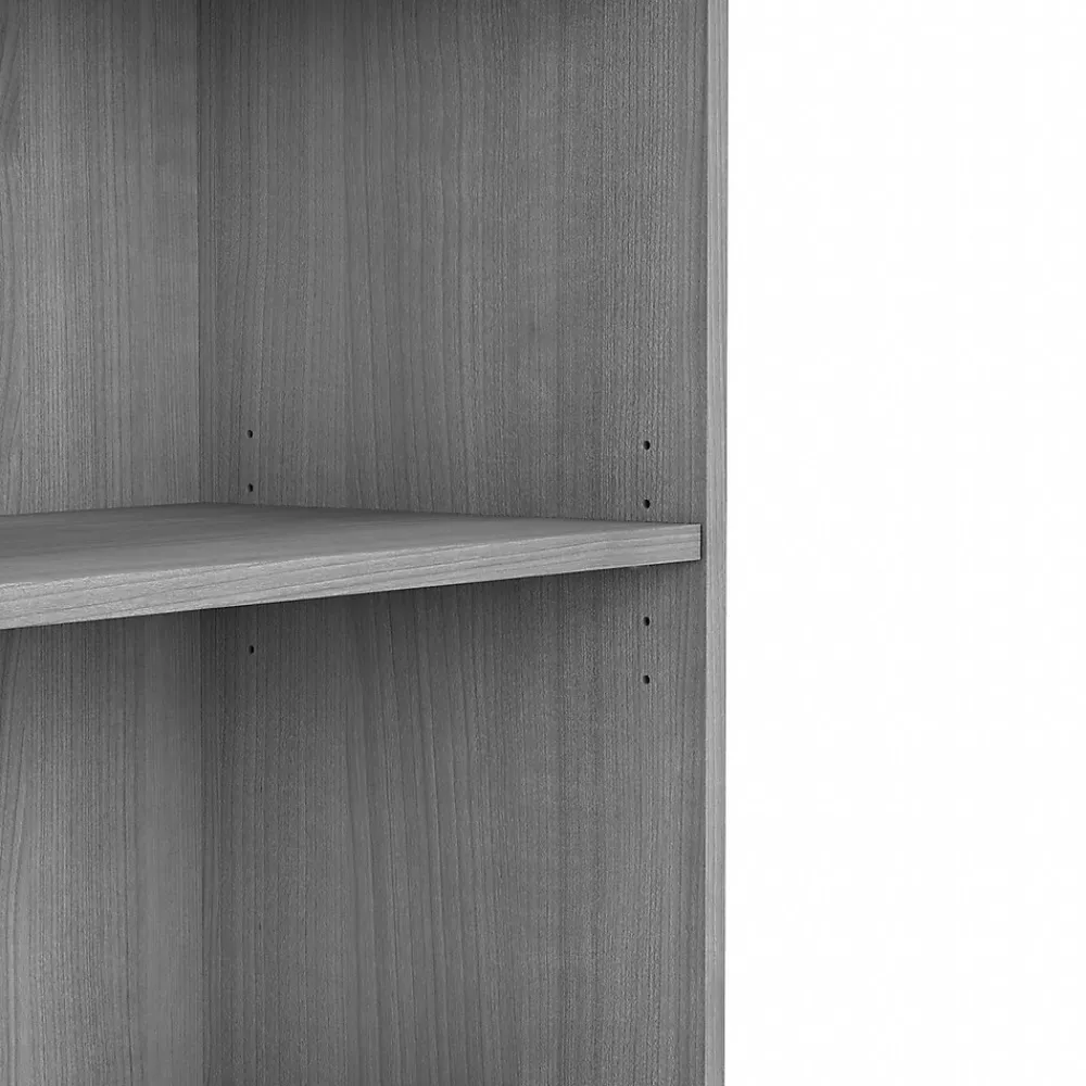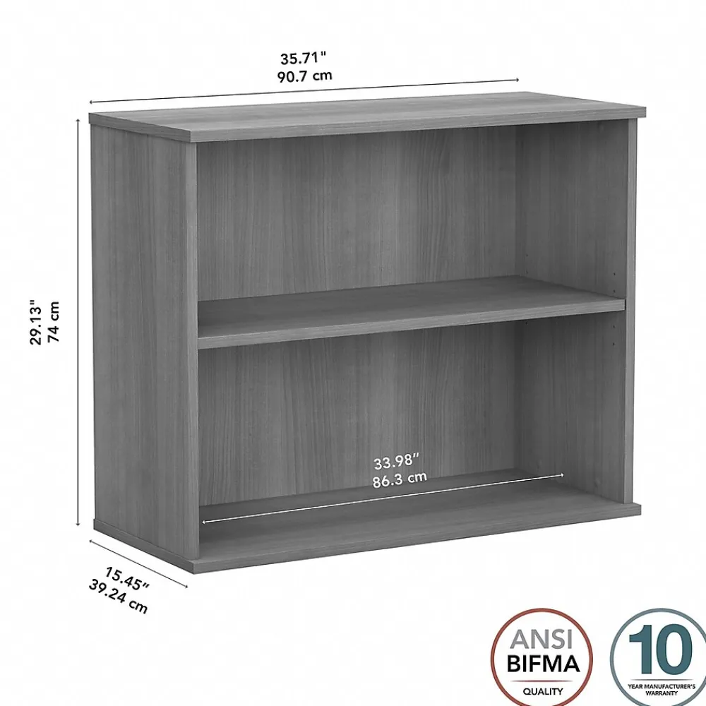 Keep work materials organized and accessible while conveying a classic, professional appearance with the Bush Business Furniture small two-shelf bookcase. Use the shelves to store books, reference materials, and supplies, or give your office a personal touch with pictures and decorations. One shelf is fixed for stability, and the other can be raised or lowered to accommodate items of various sizes. Each shelf supports up to 50 lbs., so storing larger materials is no problem. The efficient design and commercial-quality construction of this low bookcase make it an ideal storage and display solution for home and professional offices alike. A stable design and included wall attachment hardware provide peace of mind in every work environment. This small bookcase has been tested to meet ANSI/BIFMA quality standards for safety and performance and is backed by a 10-year manufacturer warranty.