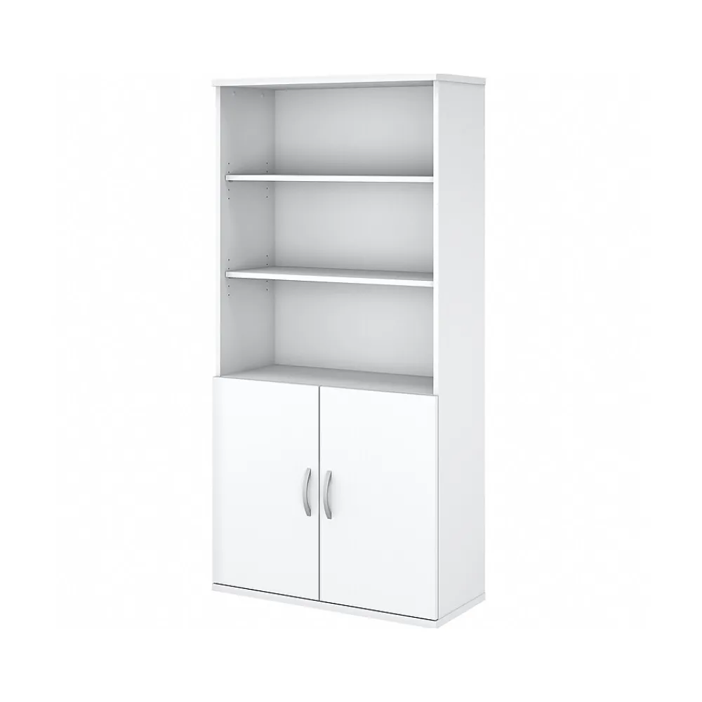 The Bush Business Furniture Easy Office five-shelf bookcase with doors combines open and closed storage to offer a perfect organization solution for the professional workplace. Three adjustable shelves accommodate books and binders of various sizes, while two fixed shelves provide stability. Each shelf supports up to 50 lbs., so storing larger items is no problem. Doors cover the two lower shelves to conceal the supplies you want to be kept in order but out of sight. Use the upper portion of the tall bookshelf to organize materials, or give your office a personal touch by displaying pictures and decorations. Find the perfect look for any space with traditional and contemporary finish options complemented by brushed nickel hardware. This bookcase cabinet is tested to meet ANSI/BIFMA standards for safety and performance and is backed by a 10-year manufacturer limited warranty.