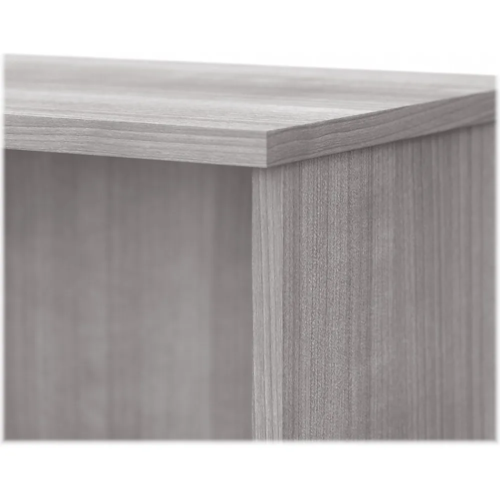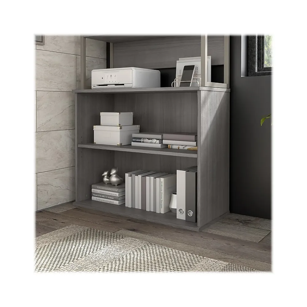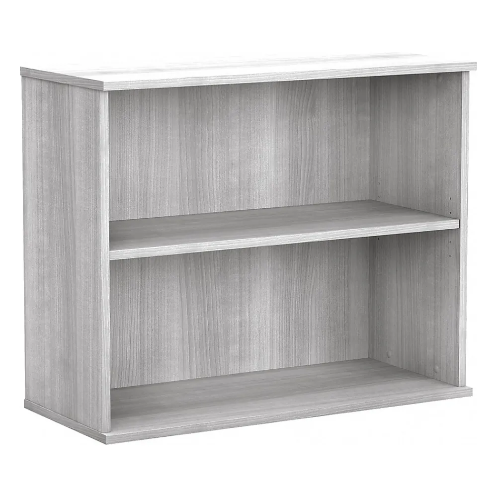 The Bush Business Furniture Hybrid small two-shelf bookcase offers a stylish, long-lasting storage and display solution for the modern professional. Organize books and other reference materials, or give your workspace a personal touch with pictures and decorations on shelves that support up to 50 lbs. each. One shelf is fixed for stability, while the other can be raised or lowered to accommodate items of various sizes. The low bookcase’s stable design and included wall attachment hardware make it a safe choice for use in virtually any home or professional office environment. Find the perfect look for your space with five contemporary finish options: black walnut, modern hickory, platinum gray, storm gray, and white. This small bookcase has been meticulously tested to meet or exceed ANSI/BIFMA quality standards for safety, durability, and performance and is backed by the Bush Business Furniture 10-year manufacturer warranty. See the full Hybrid collection for coordinating items to enhance your workspace as needed, including computer desks, file cabinets, and storage cabinets (coordinating items sold separately). American-made with US and imported parts.