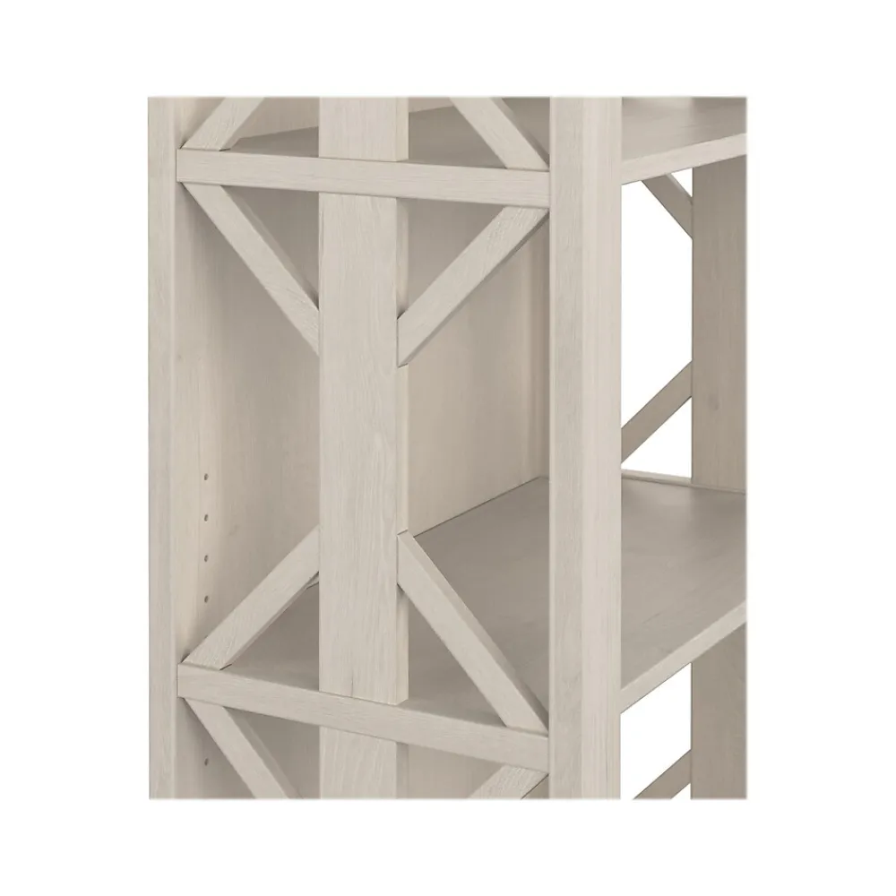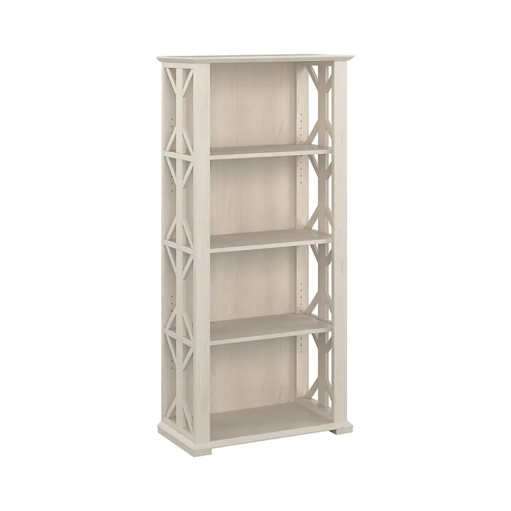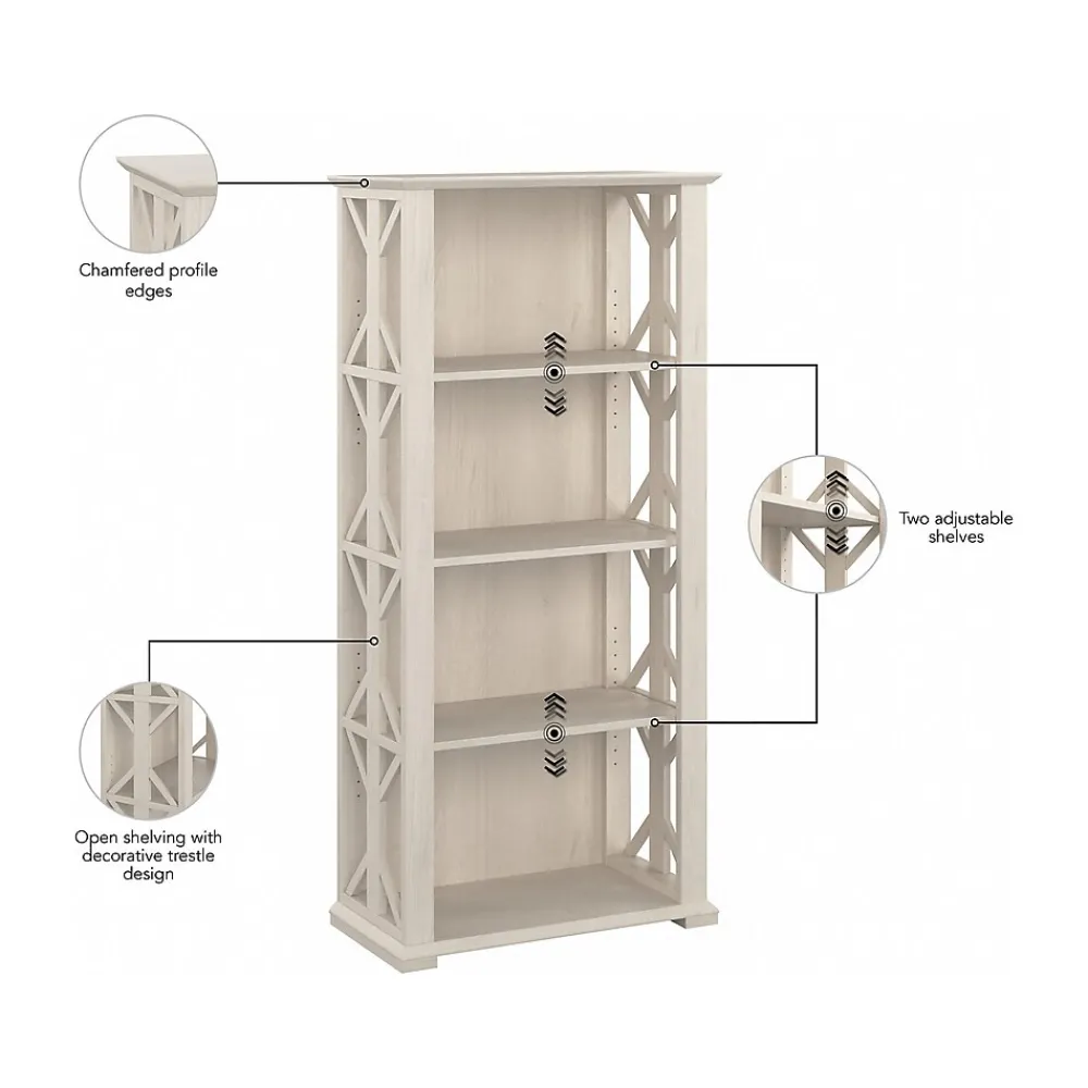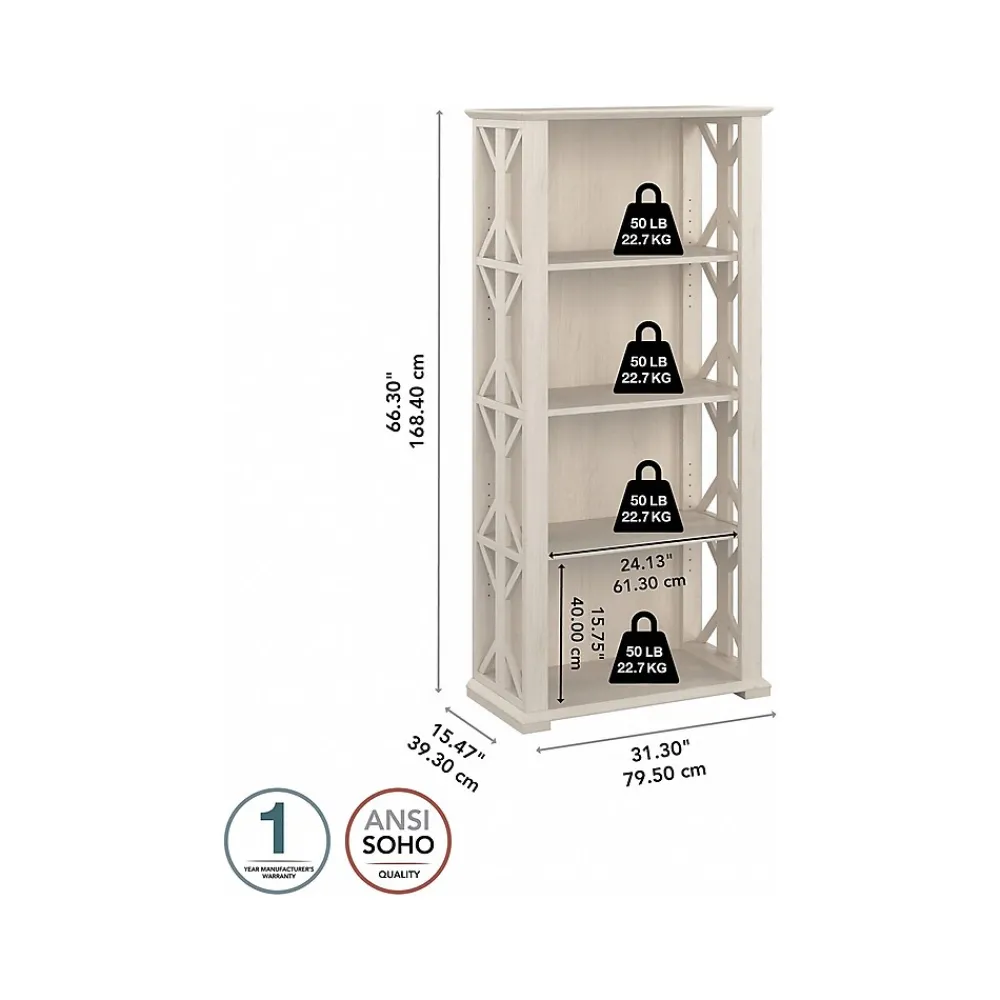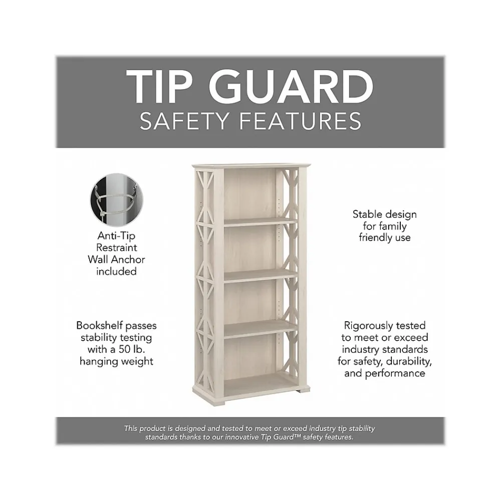 Organize books or give your workspace a personal touch with the Bush Furniture Homestead four-shelf farmhouse bookcase. Safely display pictures and decorations on shelves that support up to 50 lbs. each. Two shelves are fixed for stability, while two can be raised or lowered to accommodate items of various sizes. Tip Guard safety features include a stable design and wall attachment hardware for family-friendly safety in any space. The bookcase has been tested with a 50 lbs. hanging weight to create a safe environment in any work or living space. The decorative trestle pattern and chamfered profile edges give this bookcase a casual farmhouse style. This bookcase has been meticulously tested to meet or exceed the ANSI/SOHO quality standards for safety, durability, and performance and is backed by a 1-year manufacturer warranty. See the full collection for coordinating items.