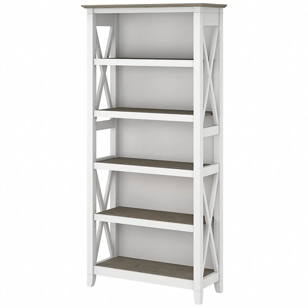 The Bush Furniture Key West tall five-shelf bookcase is a perfect way to show off your favorite artwork, photos, plants, and more. Three adjustable shelves accommodate items of various sizes while two fixed shelves provide stability. Each shelf supports up to 50 lbs. so you can store your personal library and display decorations with confidence. Stylish touches include unique X-pattern accents on the side panels as well as a sturdy and attractive post leg design. This five-tier bookcase includes wall attachment hardware for family-friendly safety and security in any home office or living room. A perfect choice for homes that embrace cottage, coastal, and farmhouse decor, the Bush Furniture Key West collection includes a variety of coordinating items to expand your space as needed. This tall bookcase is tested to meet ANSI/SOHO quality standards for safety and performance and is backed by a 1-year manufacturer warranty.