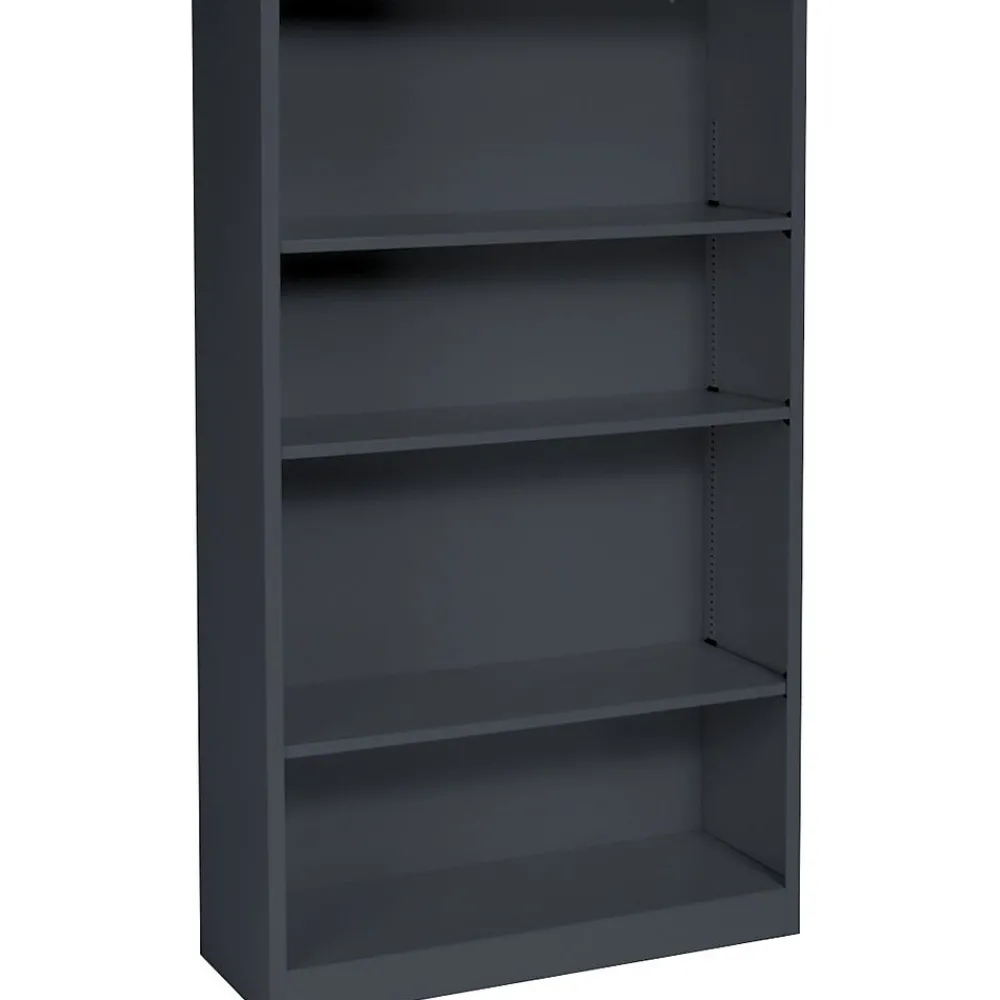 HON Brigade Metal bookcase in charcoal color measuring 59″ x 34 1/2″ x 12 5/8″ has 11 3/4″ deep shelves that adjust in 1/2″ increments to hold any size item safely. Bookcase with four shelves has a heavy-duty construction for durability.