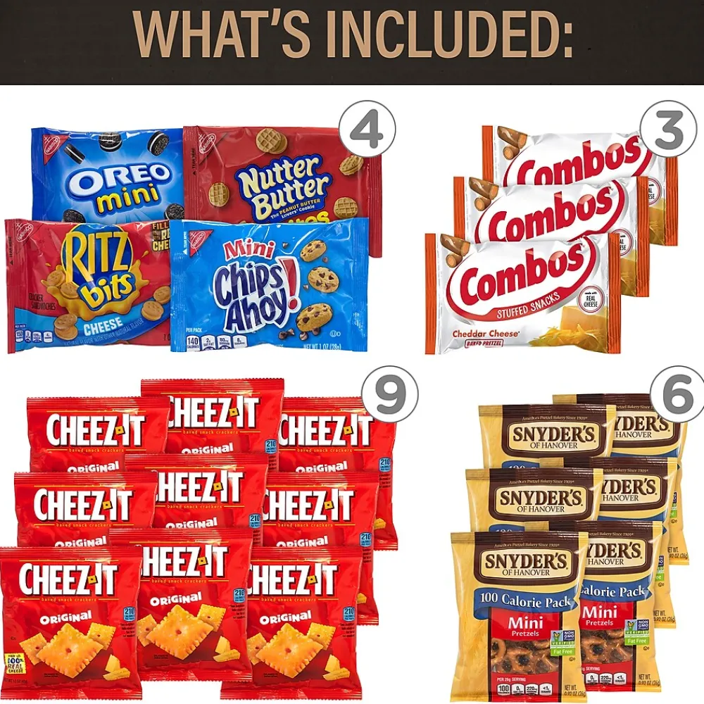 - A box filled with 75 Party Snacks in a variety of types and flavors