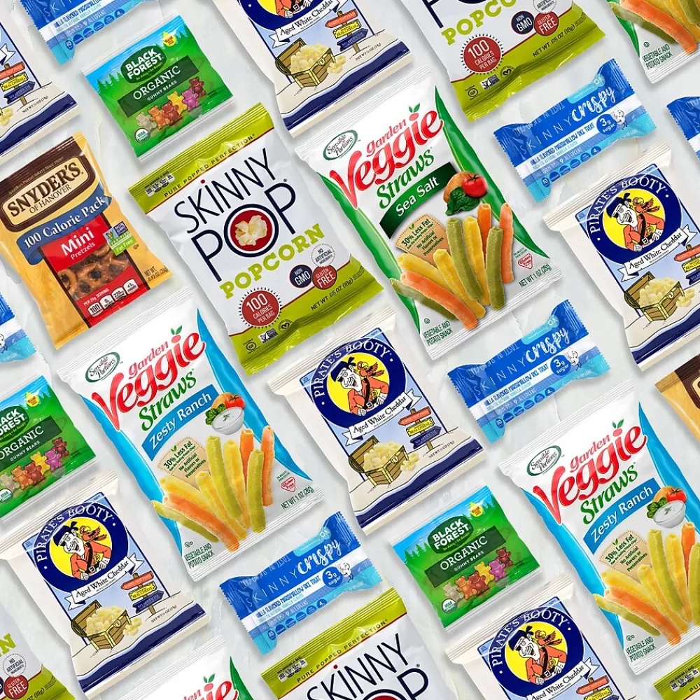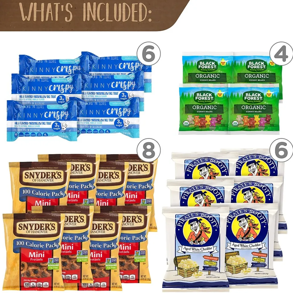- This snack box includes Stonyfield Fruit Snacks, Skinny Crispy, Pirate’s Booty, Skinny Pop, Veggie Straws and Snyder’s Mini Pretzels
