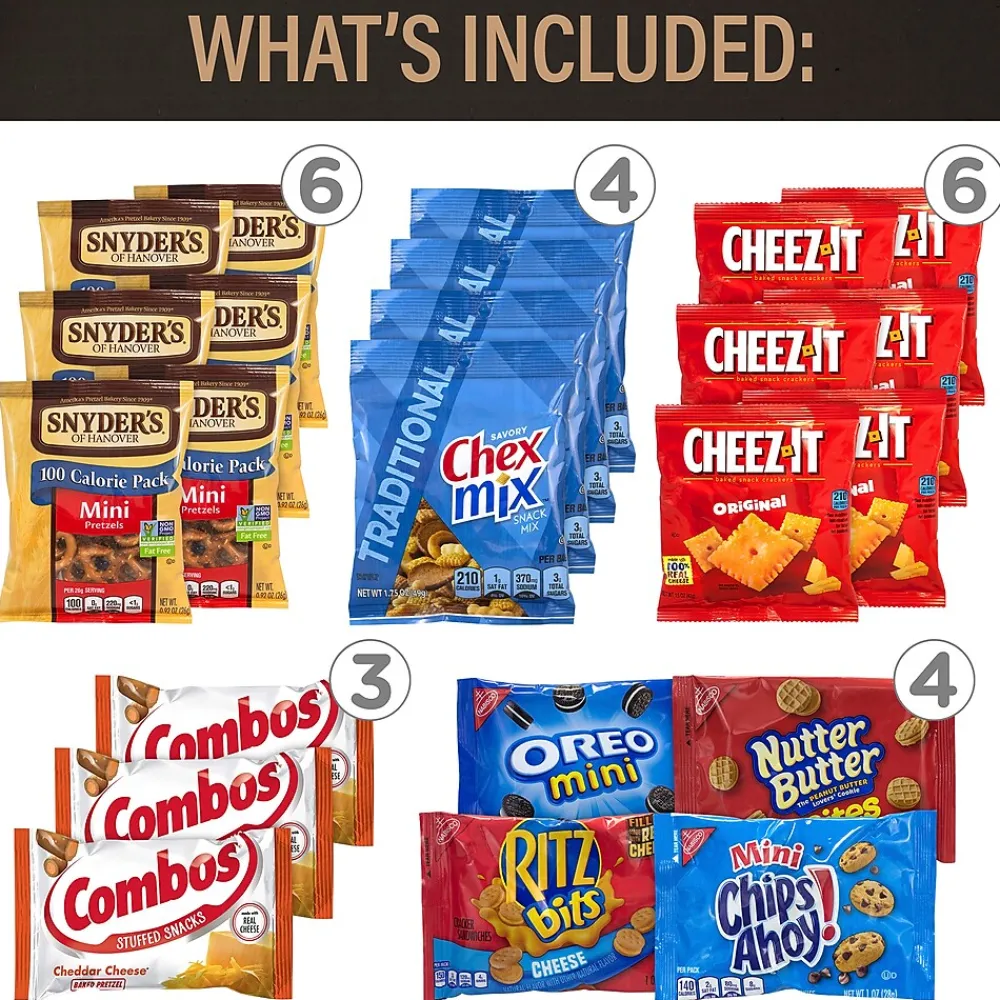 - Each box contains: four Welch’s Mixed Fruits Snacks, three M&M ‘s Candies, four Goldfish Crackers Variety, four Nabisco Cookie & Cracker Variety, four Dot’s Pretzels Honey Mustard Bags, six Sunshine Cheez, four Pringles Variety, three Combos Baked Snacks, four Chex Mix Traditional Flavor, three Rice Krispies Treats, six Snyder’s Mini Pretzels 100 Calorie Bags