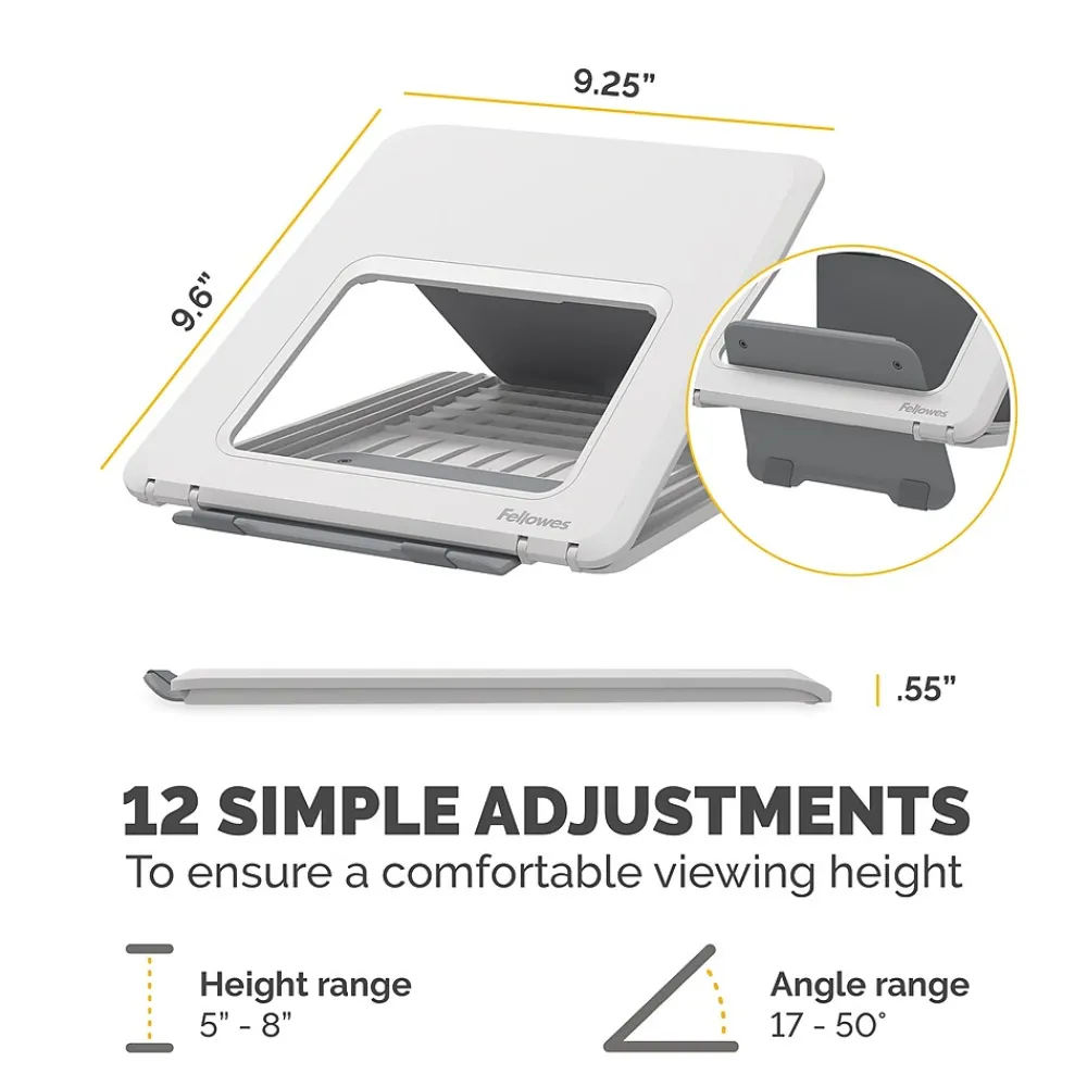 This Fellowes Breyta White laptop riser 100098501 has 12 height adjustments with unique front lift to provide additional height for ergonomic viewing comfort. Compact, lightweight, and portable design that is easy to set up and adjust – ideal for hybrid working. Holds up to 14” laptops weighing up to 8.8lbs. Modern and simple design. Made from materials which are 100% recyclable through Fellowes take-back program. Please contact Fellowes Customer Service for more information. Made to last with extended 5-year limited warranty.