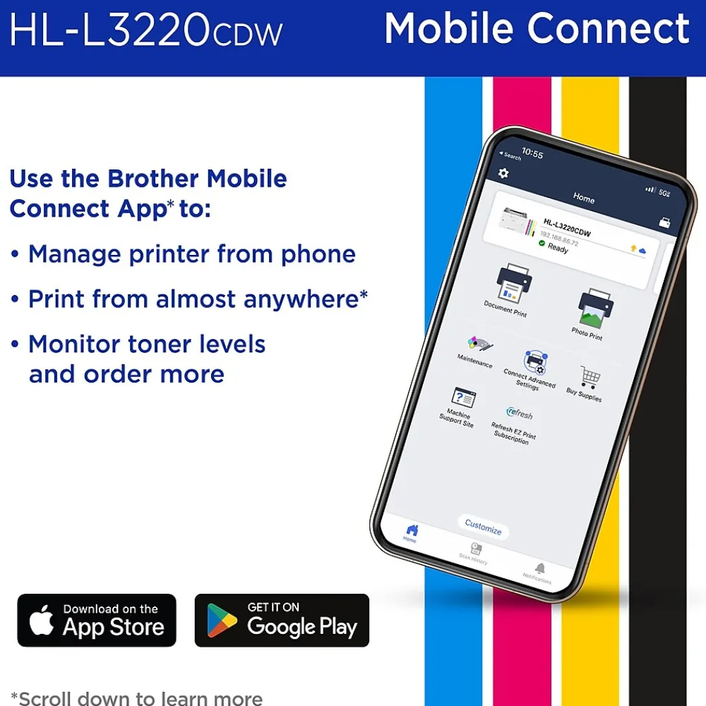 - PRINT FROM VIRTUALLY ANYWHERE. Brother Mobile Connect app puts the power of printer management in your hands. Print remotely, monitor toner levels, and reorder Brother Genuine supplies.(3)