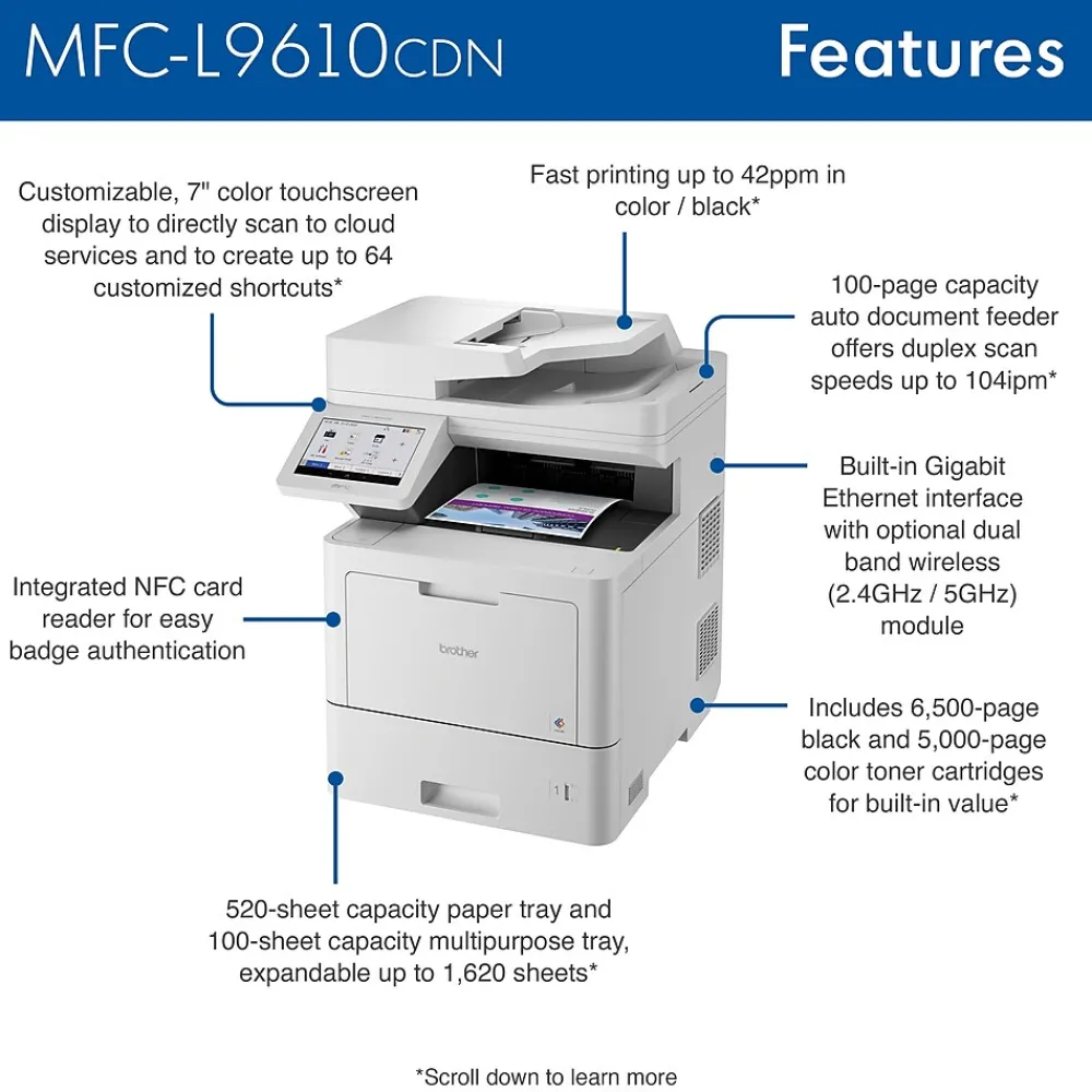 The Brother MFC-L9610CDN color all-in-one printer is designed for how work now works, providing enterprise-class functionality, triple-layer security features, and scalable paper handling in a compact footprint that is perfect for mid- to large-size workgroups.