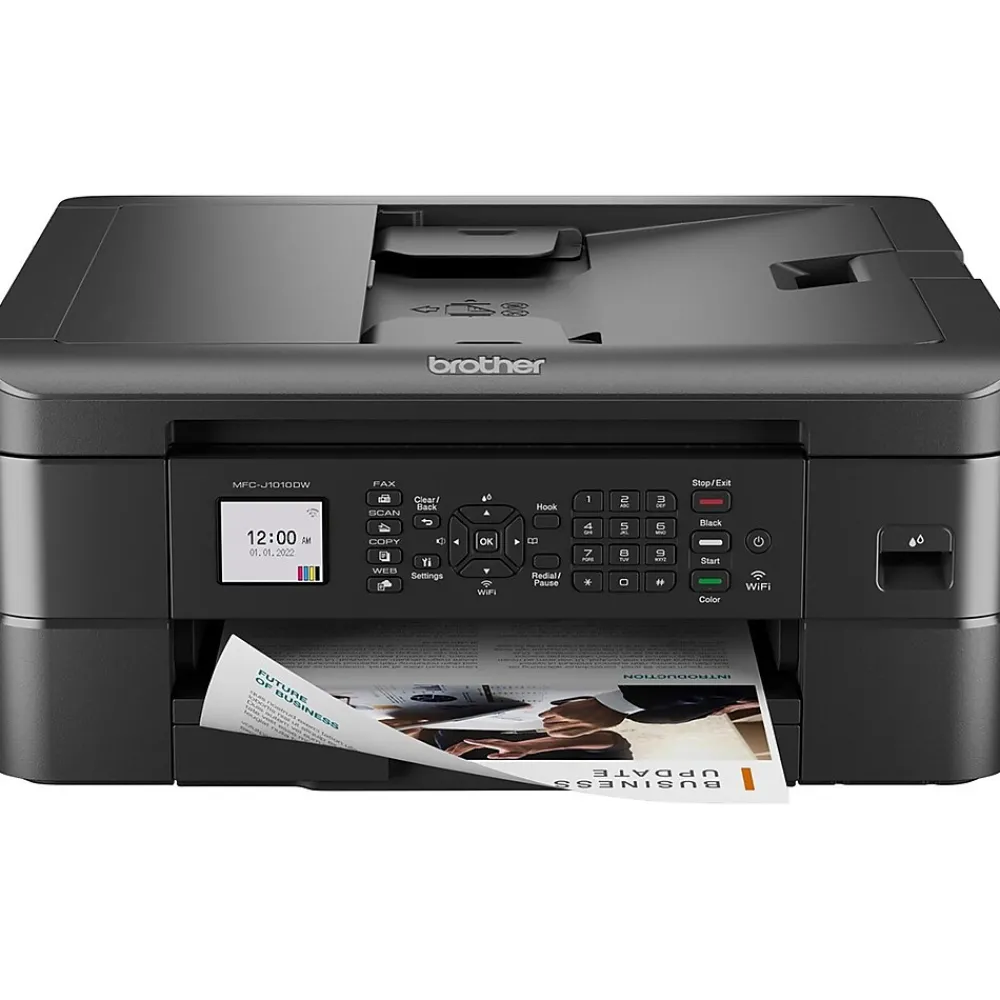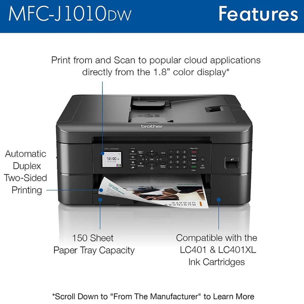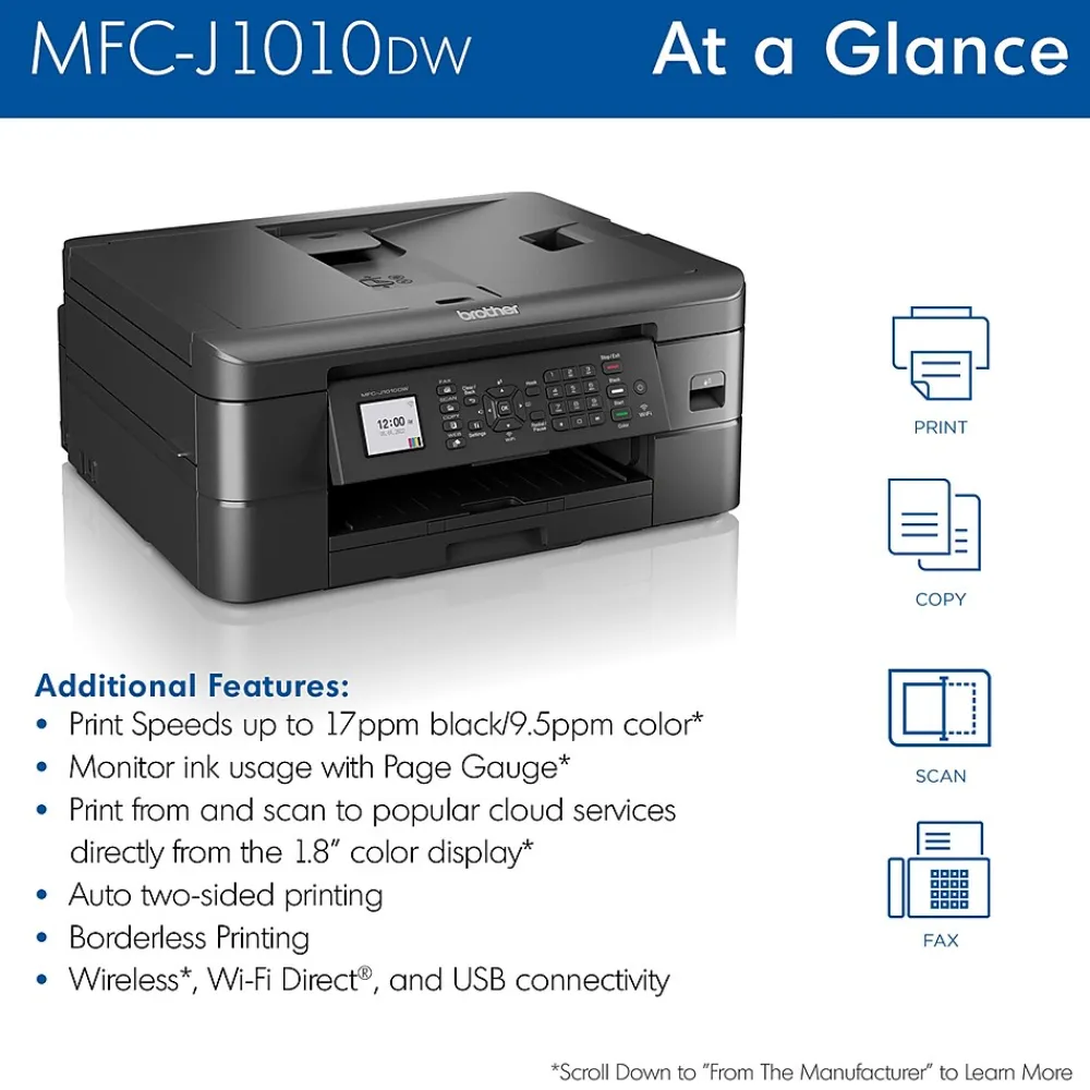 The affordable Brother MFC-J1010DW is an ideal color inkjet all-in-one printer for your home, home office or small office. It includes robust features and business-centric functionality not normally found in similarly priced inkjet printers plus print speeds up to 17 ppm for black and white and 9.5 ppm for color. The MFC-J1010DW is easy to connect and operate along with being compact and economical, perfect for small spaces and budgets. This wireless printer has multiple flexible connection options, including a built-in wireless interface for sharing with multiple users on your network, Wi-Fi Direct® or connect locally to a single computer via a USB interface. Delivering high quality, reliable printing, copying, scanning and faxing and enabling wireless printing from your desktop, laptop, smartphone or tablet. Use the 1.8” color display to easily navigate on screen menus. This printer features the Brother Mobile Connect App, a user-friendly interface that gives you the freedom to print and manage your printer from virtually anywhere. The MFC-J1010DW also features the unique Brother Page Gauge which estimates remaining page levels, so you always know how much ink you have left. Use the 20-page capacity automatic document feeder or the 150-sheet capacity adjustable paper tray for generous output without constant monitoring. Two-sided printing helps save paper, while mobile device printing and Cloud connectivity let you print-from and scan-to popular Cloud services directly from the device. Comes with a 1-year limited warranty and free online, live chat or phone support for the life of the printer.