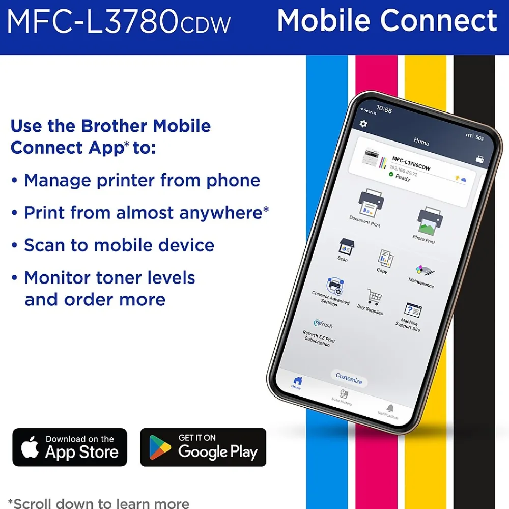 - PRINT FROM VIRTUALLY ANYWHERE. Brother Mobile Connect app puts the power of printer management in your hands. Print remotely, scan to mobile app, monitor toner levels, and reorder Brother Genuine supplies.(9)