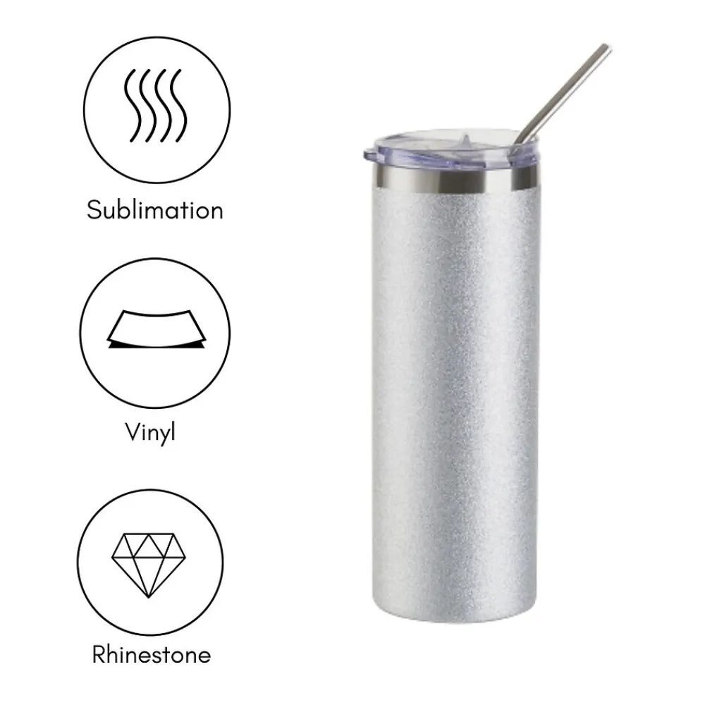 - The 20oz silver glitter stainless steel skinny vacuum insulated tumblers and 18oz blank stainless steel water bottles have superior sublimation coating to ensure your designs stay vibrant