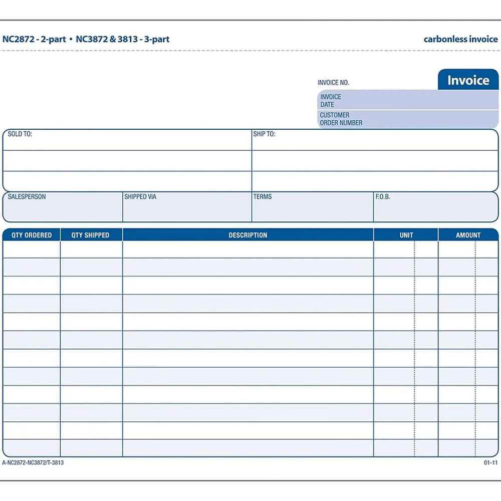 Adams® Carbonless invoices measuring 8-1/2″ x 7-7/16″ features 3-parts carbonless paper sequence with ruled format. Invoices are ideal for use in accounting forms and business forms.