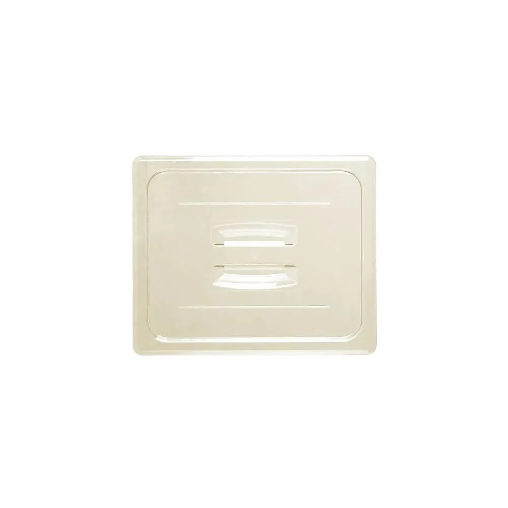 This amber Cambro 20HPCH150 H-Pan 1/2 size high heat handled lid is perfect for holding high heat and freezing foods in any commercial kitchen. It’s built with strong, durable materials to withstand extreme temperatures from -40 to 300 degrees Fahrenheit and will help maintain your food’s temperature after it’s taken out of the oven or freezer. To aid in storage and transport, this flat cover conveniently stacks with similar items to create more usable space.