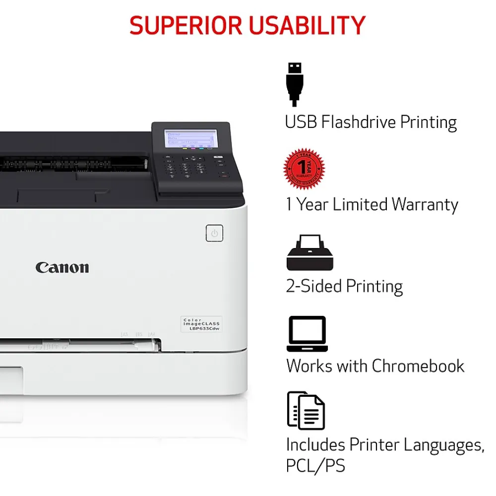 Canon Color imageCLASS’s diverse features and durability give you the confidence and flexibility to print everything from beautiful photos to impressive documents at home and in your small office. The LBP633Cdw model balances speedy performance with minimal maintenance. High-capacity toner option keeps up with your printing needs and limits toner replacement interruptions. Connect this printer to a wireless network in four simple steps. Print on the go with Canon PRINT Business, Apple AirPrint, and Mopria Print Service. Features a compact design. Compatible with Windows, macOS, and ChromeOS. With smart reorders, Alexa can automatically reorder essentials like ink and toner wherever you’re running low. All convenience, zero remembering.