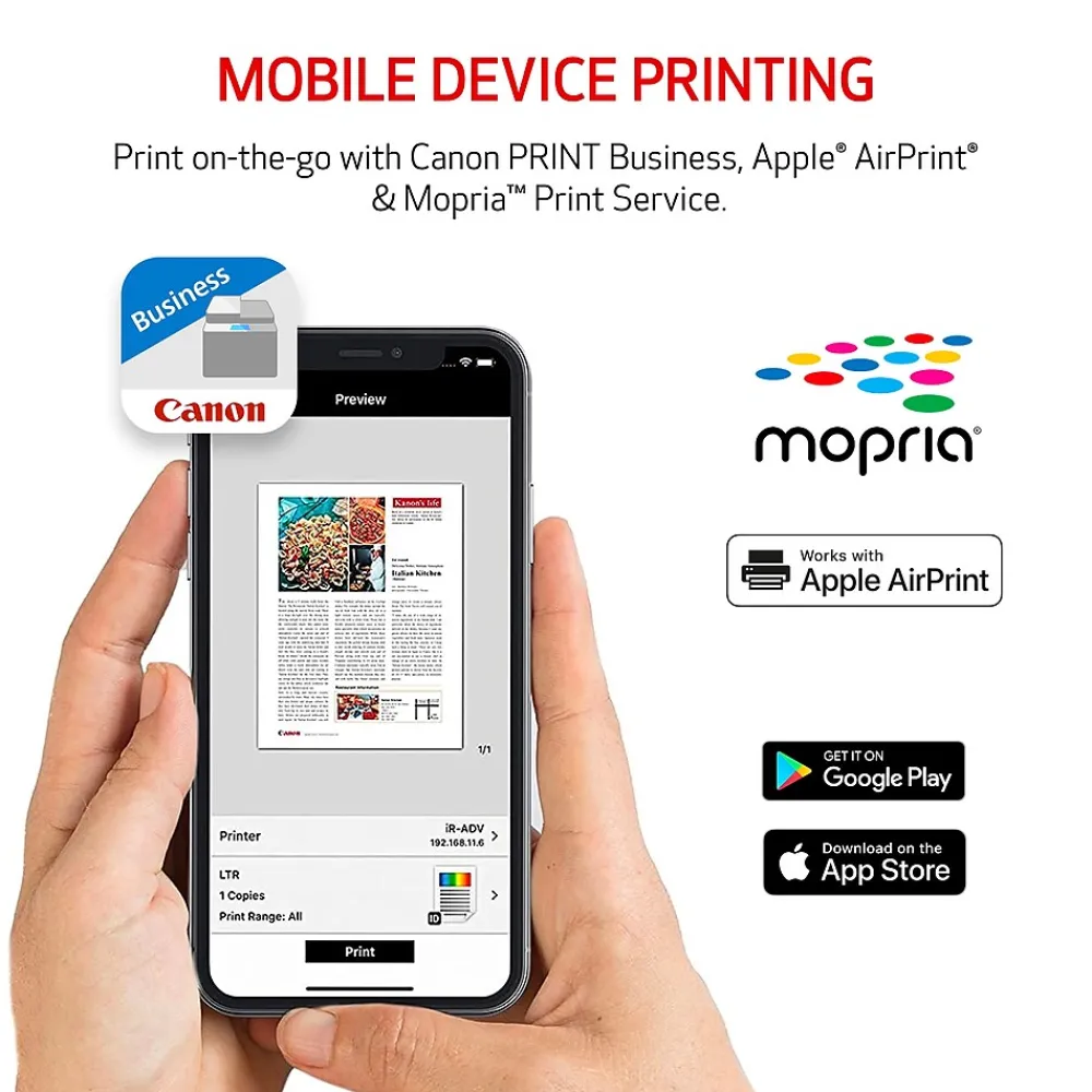 | Media Types Supported | Canon Print Business, Mopria Print Service, Apple AirPrint |